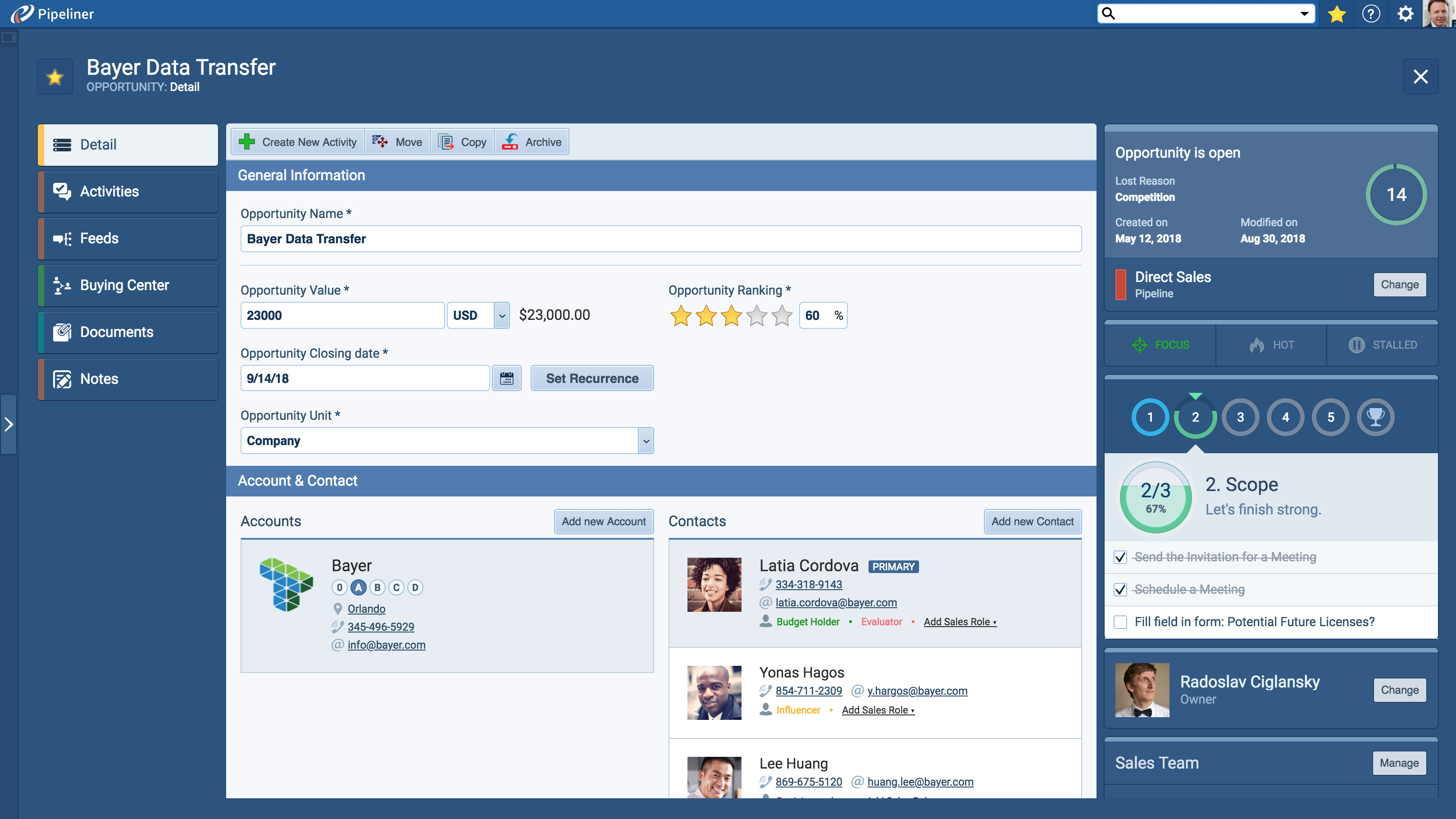 With Coevera’s completely visual, intuitive approach, prospects and customers can be readily viewed and appraised, and opportunities are ranked and can be instantly prioritized. Sales management can view opportunity status with regard to single reps, teams or an entire sales force.