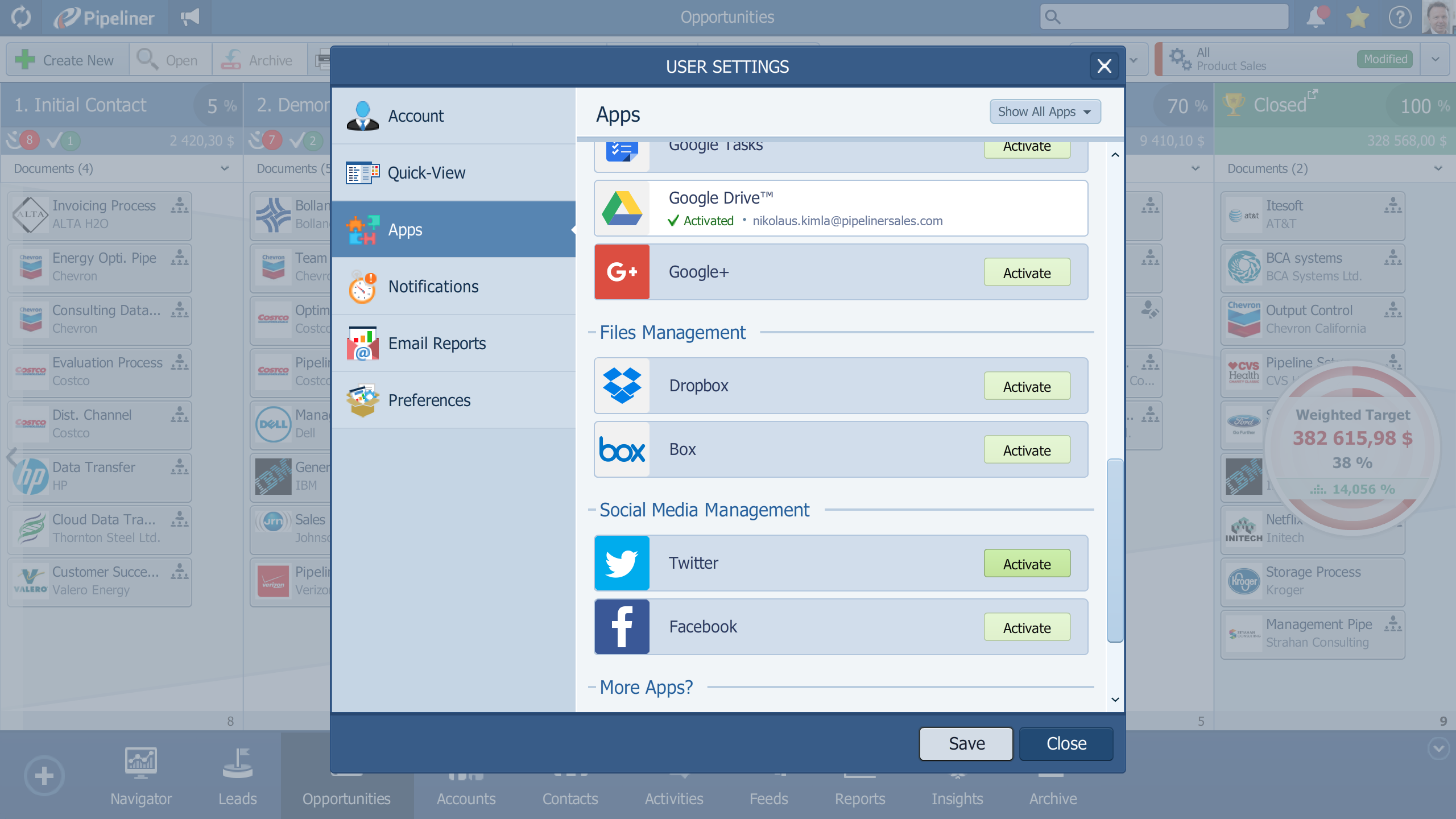Email, Calendar, Contacts and Tasks—We have deep email and Google CRM integrations with all the main mail services: Office, Outlook, Gmail, as well as GoogleDocs.