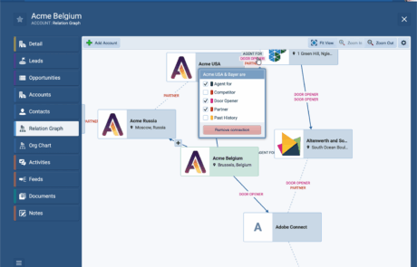 Accounts Relations is a dynamic CRM feature that allows you to map and visualize the complex, real-world connections between different business accounts (companies) using the Relation Graph.