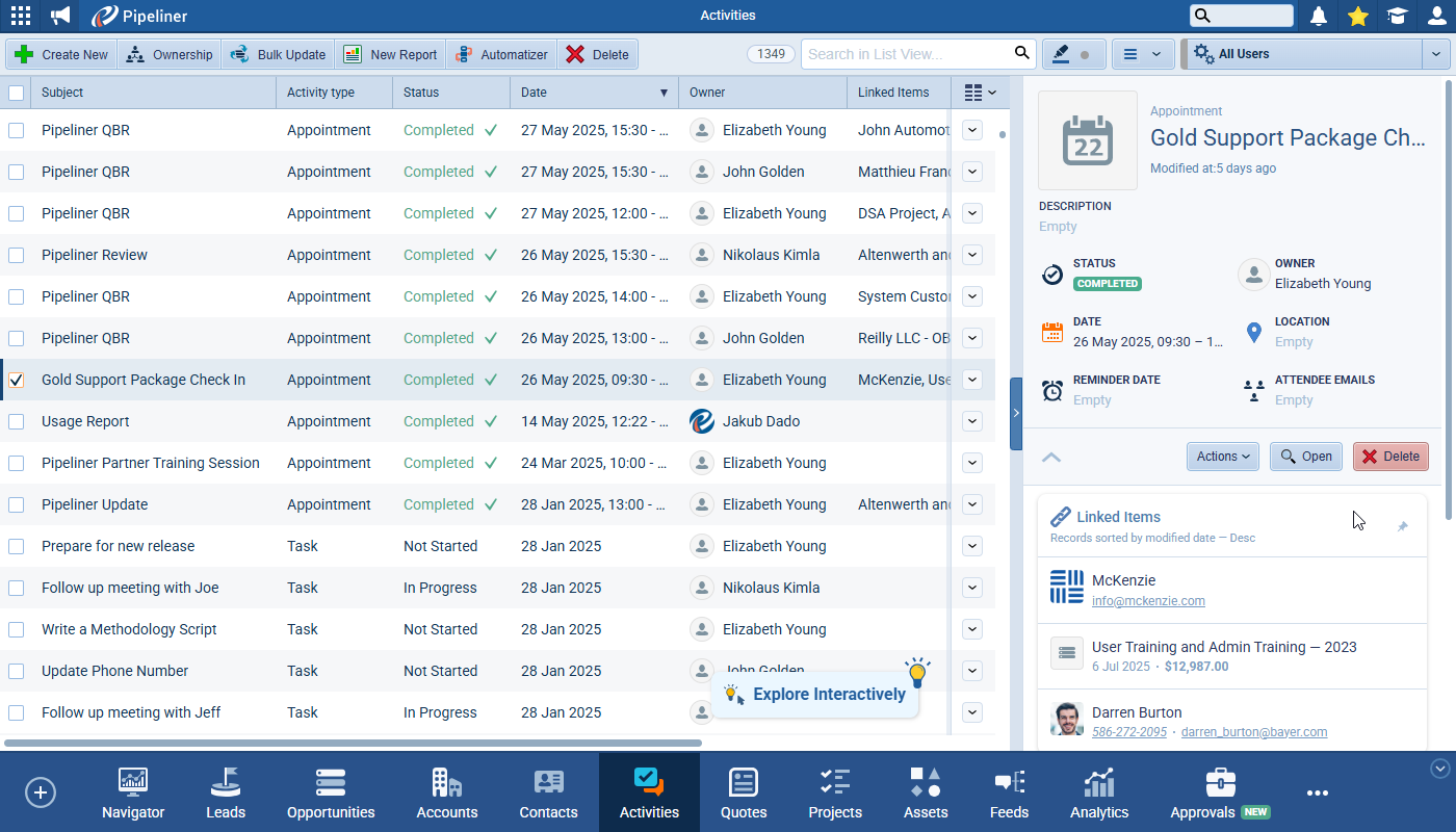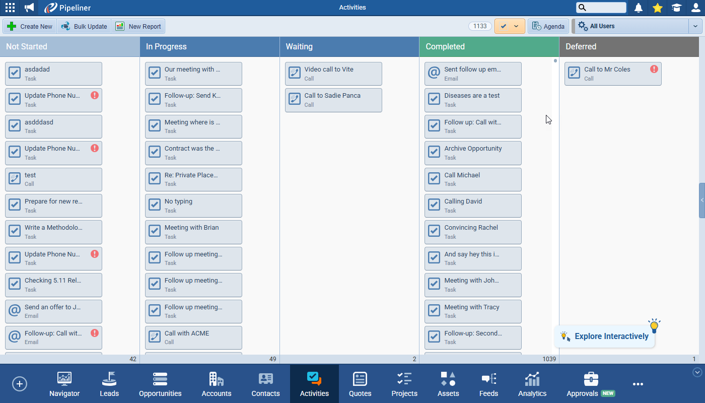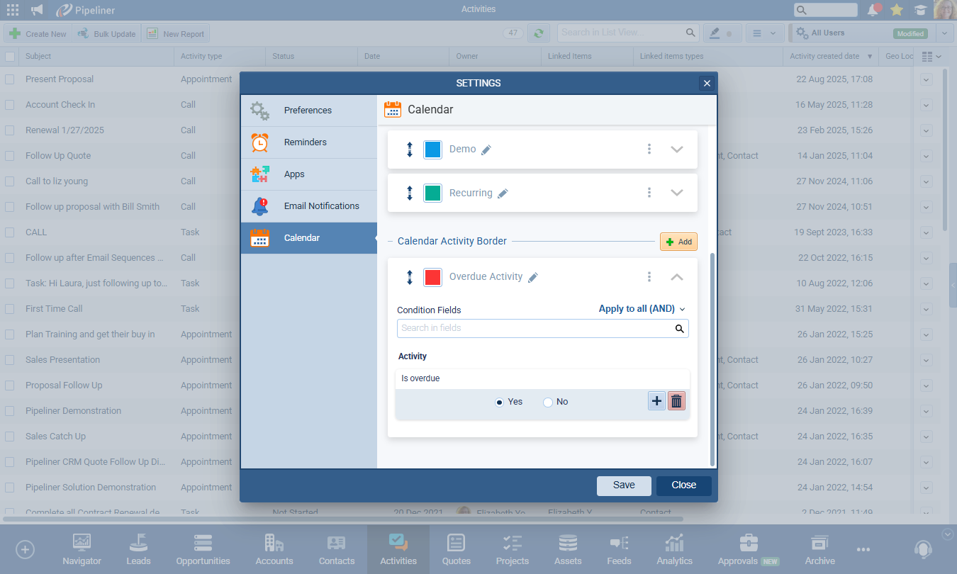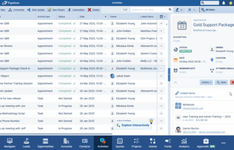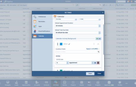 A CRM Activity is any interaction or action related to moving a potential or existing client relationship forward. This typically includes Appointments (scheduled meetings and demos) and Tasks (calls, emails, follow-ups, and research).