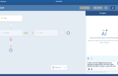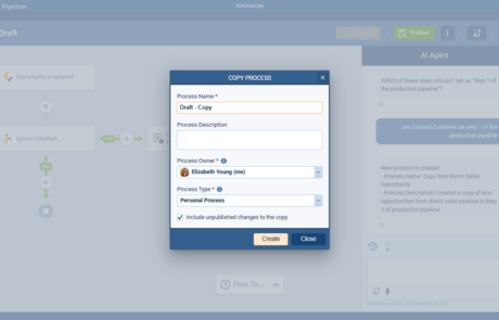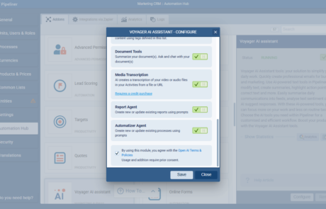 The Voyager AI Automatizer is the future of CRM workflow management. It’s easily enabled via the Voyager AI Assistant in the Automation Hub. Confirm the agent is running, click “Create with AI,” and start your conversation.