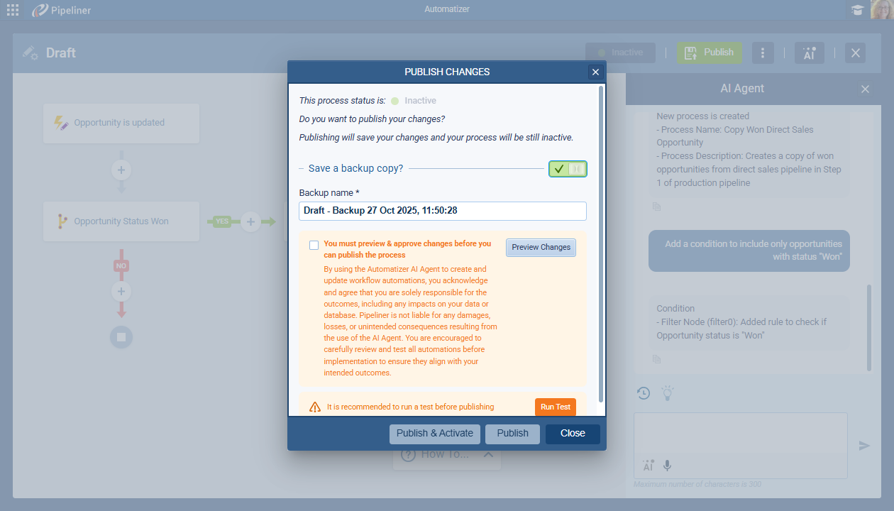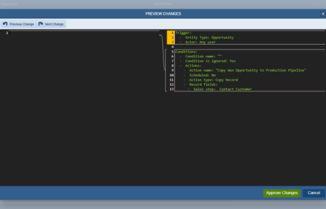 - Differential Analysis: Before publishing, you must preview and approve the changes. Our required approval system, which includes a side-by-side view, compares the new AI-generated process with the previously published version. This allows for meticulous, step-by-step review of the logic.