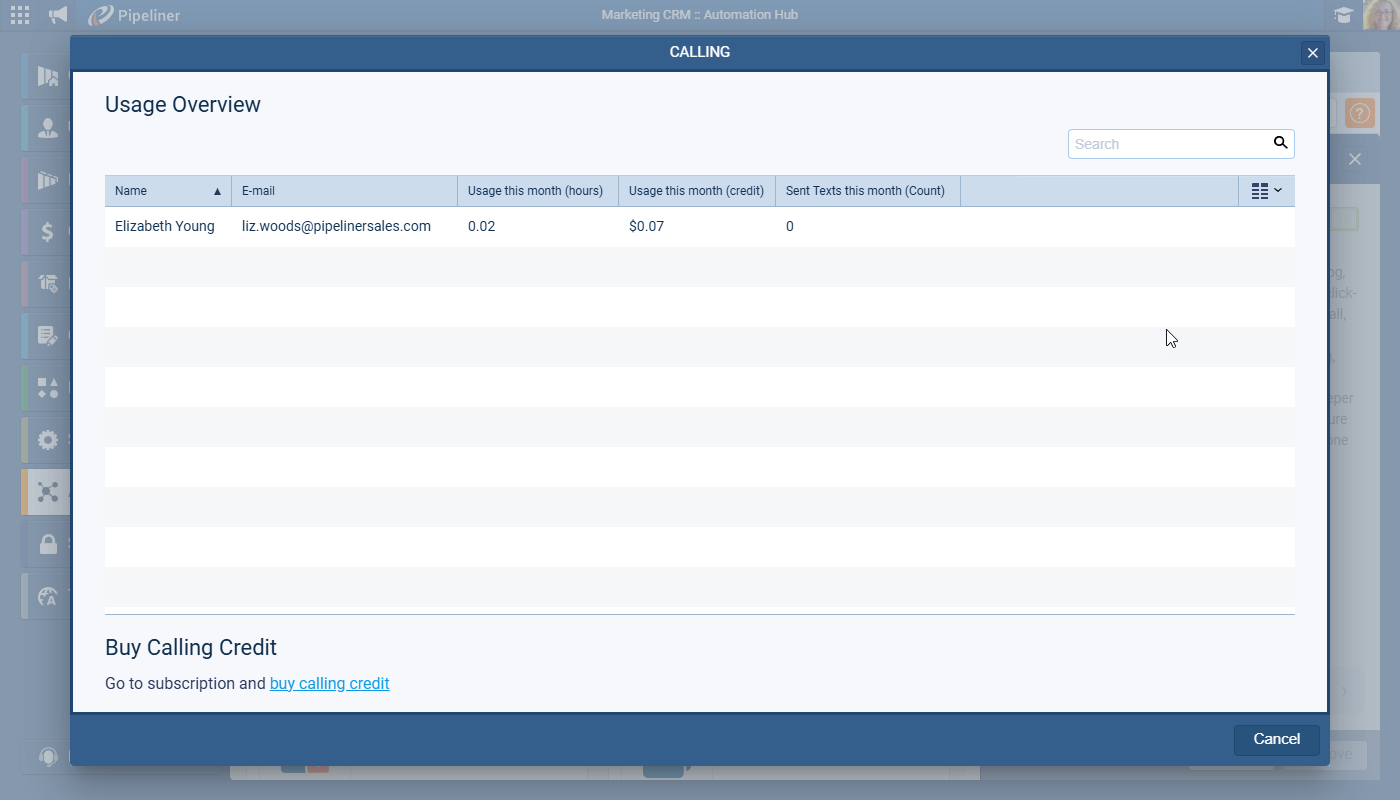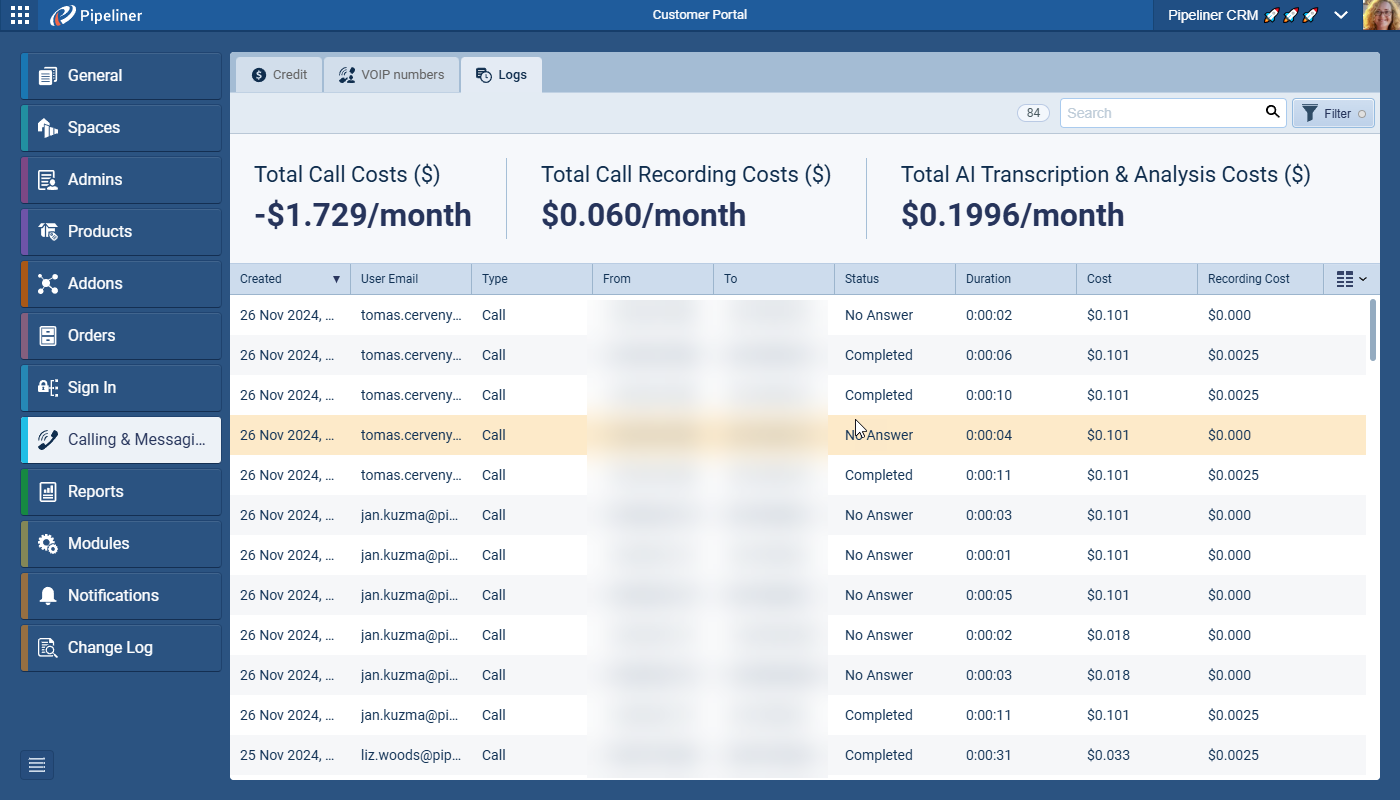 The costs are transparent and tracked for recording, transcription, and AI voice intelligence (analysis). These costs are deducted from your total Credit purchased. As an Admin, you can easily monitor a detailed, daily-updated breakdown of these AI costs per user within the Automation Hub Calling & MessagingMessaging Messaging is the process of communicating your brand’s value proposition, the benefits you offer, and the perceived meaning of such communication among your target audience. configuration page, ensuring you maintain complete control over your budget.