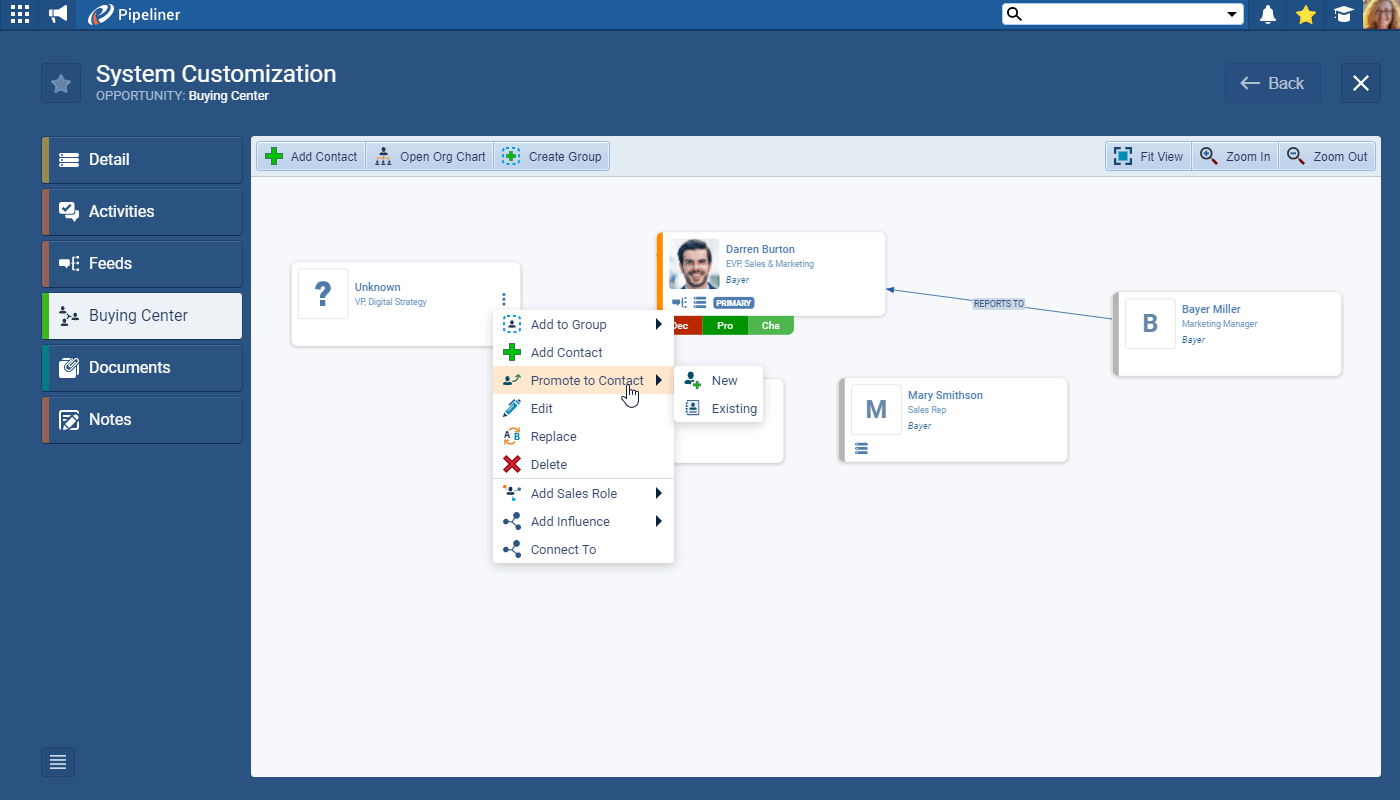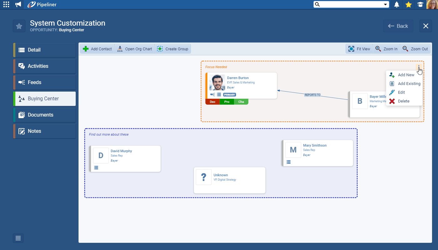 Adding contacts to opportunities is simple with the Buying Center’s contact integration feature. You can pull contacts directly from the AccountAccount Account refers to a record of primary and background information about an individual or corporate customer, including contact data, preferred services, and transactions with your company.’s Org Chart or use Ghost Contacts to represent unknown influencers. Each contact can be assigned a custom sales role, such as Budget Holder, Decision MakerDecision Maker Decision Maker in the context of sales, is a person who possesses the required expertise and authority in making purchase decisions., or Influencer, so you always know their level of influence. Relationship mapping visually indicates the strength of connections, while influence mapping shows how contacts impact each other’s decisions.