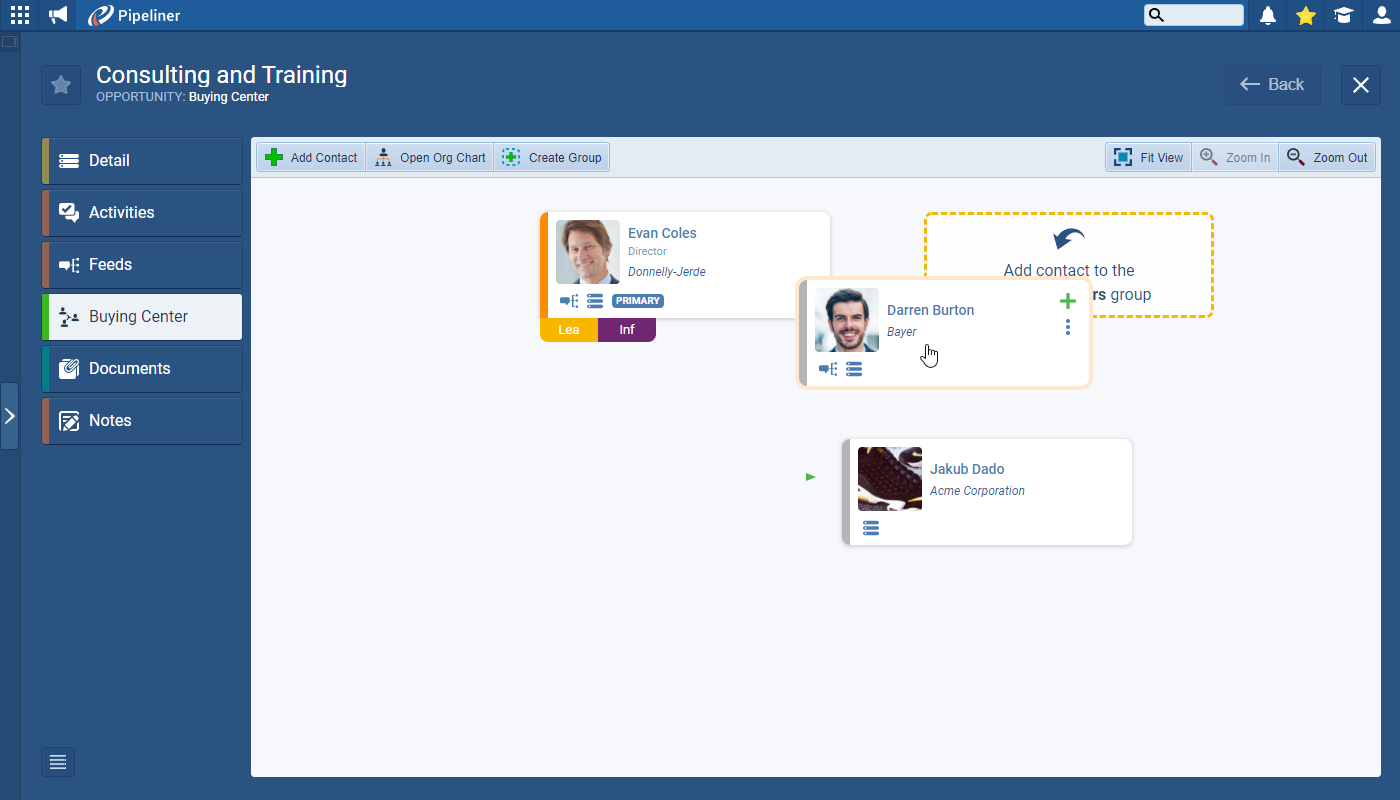 The Buying Center is a crucial tool in Coevera designed for B2B sales to help you understand the internal dynamics of your customer’s organization. It allows you to map out who influences deals and how they connect, giving you a clear picture of key players, their influence, and their relationships within an opportunity.Your ContentContent Content refers to a material or document released in various forms (such as text, image, audio, and video) and created to inform, engage or influence specific audiences. Goes Here