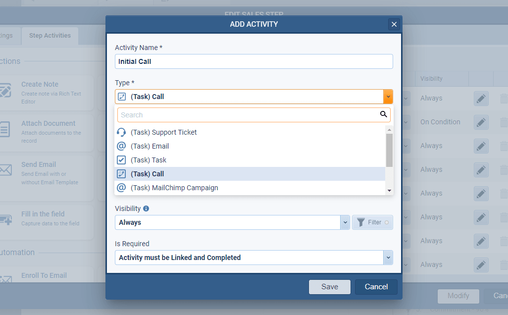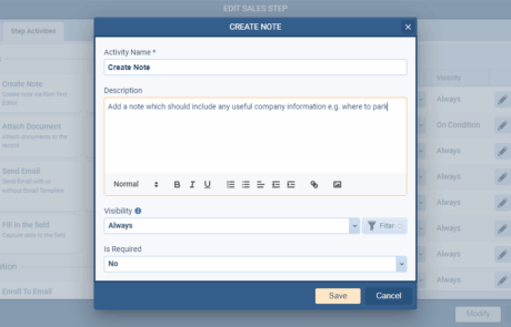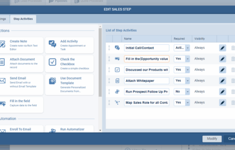 Yes, the setup is managed within the Admin Module’s Processes section. Administrators can quickly access any pipeline, select a stage, and easily add, configure, and reorder any of the 11 Step Activity types. The intuitive interface enables you to define the required action, visibility conditions, and whether the step is mandatory or optional, providing complete control over your sales process in just minutes.