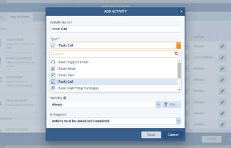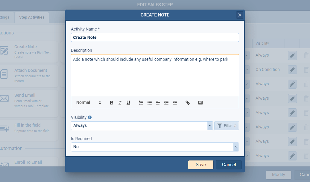 A standard activity (like a Task or Appointment) is something a rep plans to do. A Step Activity is a mandatory, guided step embedded directly into a Pipeline Stage by the Administrator. It acts as an automated, contextual reminder or a required gateway. While a standard activity can be missed, a Step Activity can be configured to prevent the Opportunity from moving forward until the necessary action (e.g., creating a note, sending an email, or filling in a specific field) is completed. It turns a suggestion into an enforced process.