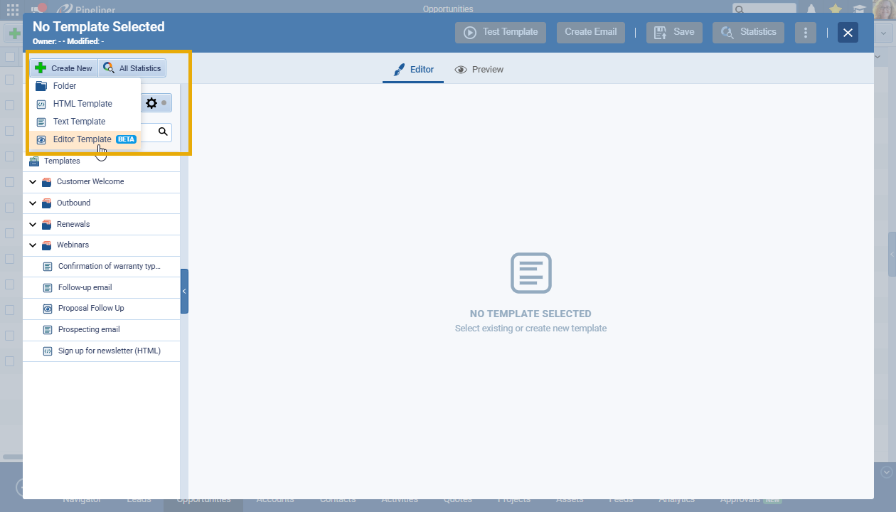 - Quick Start: Select Editor Template (Beta). Choose from an Empty layout to build from scratch, or start with pre-built frameworks like Newsletter, Announcement, or Services.