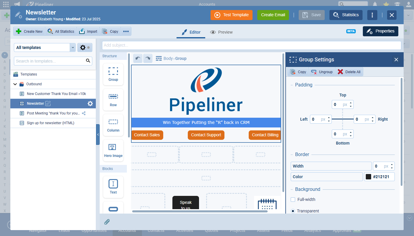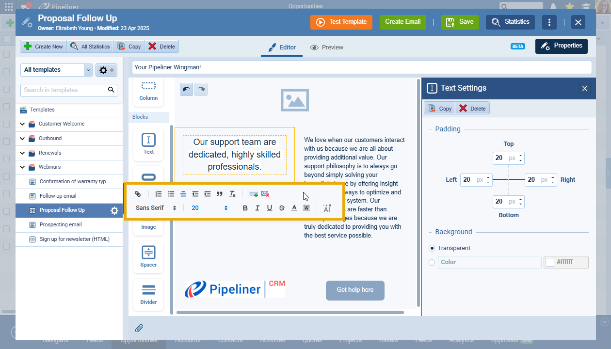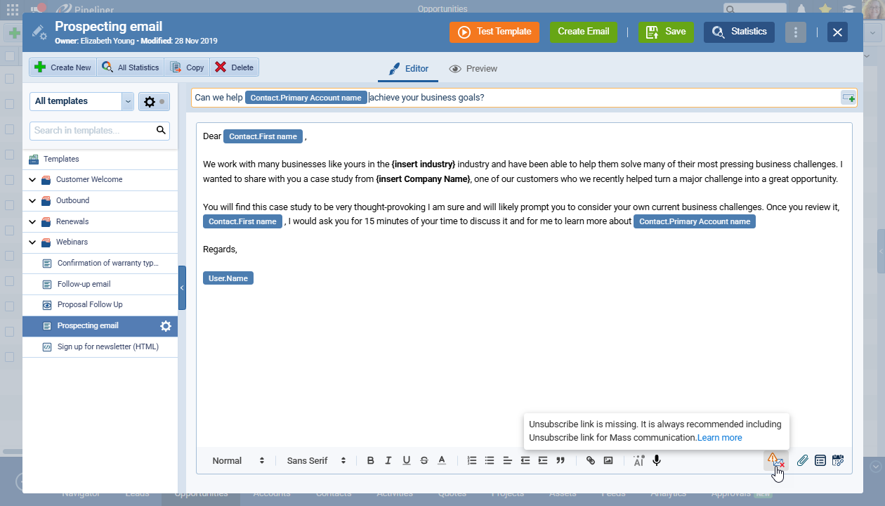- Test Template: Send a live test copy to your own email address, also populated with real data from a record you select, to see exactly what the recipient will receive.