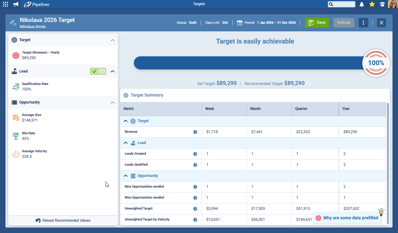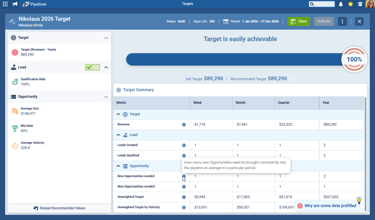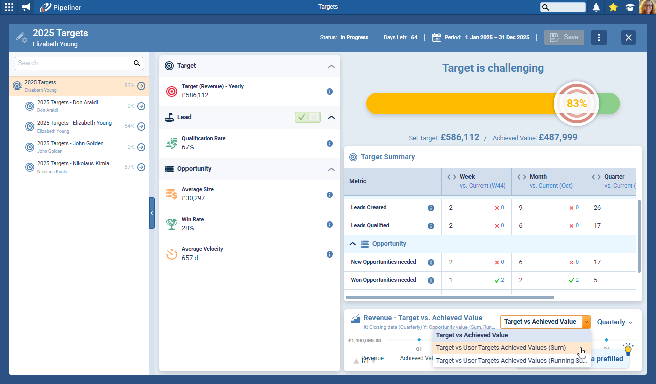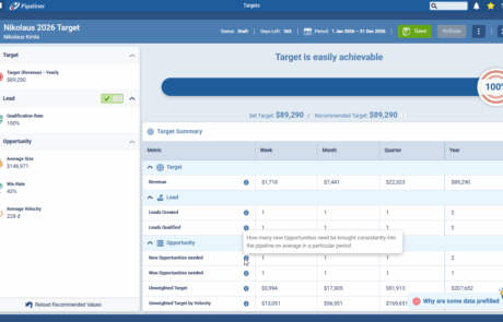 - Unified Vision (Navigator Dashboard): Your progress isn’t just stuck in the Pipeline View. The Target element is prominently displayed on the Navigator Dashboard, providing leadership and users with an instant, high-level snapshot of goal attainment upon login.