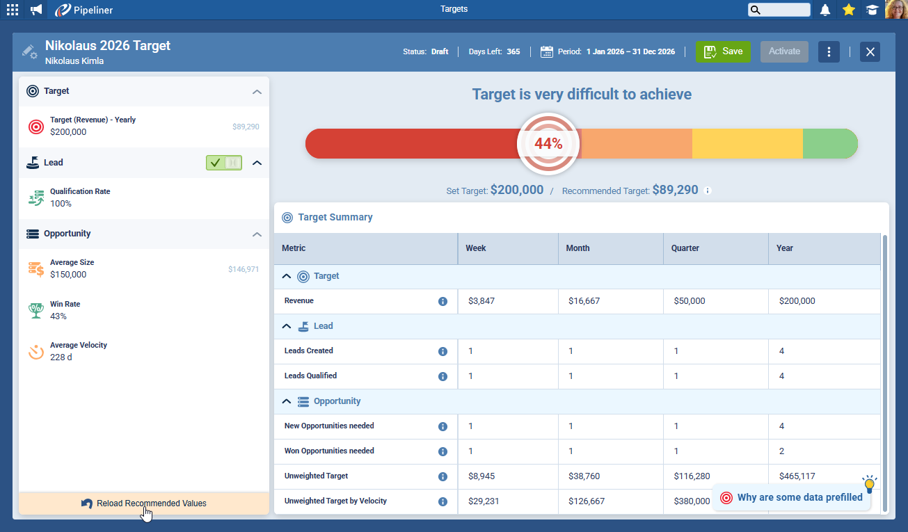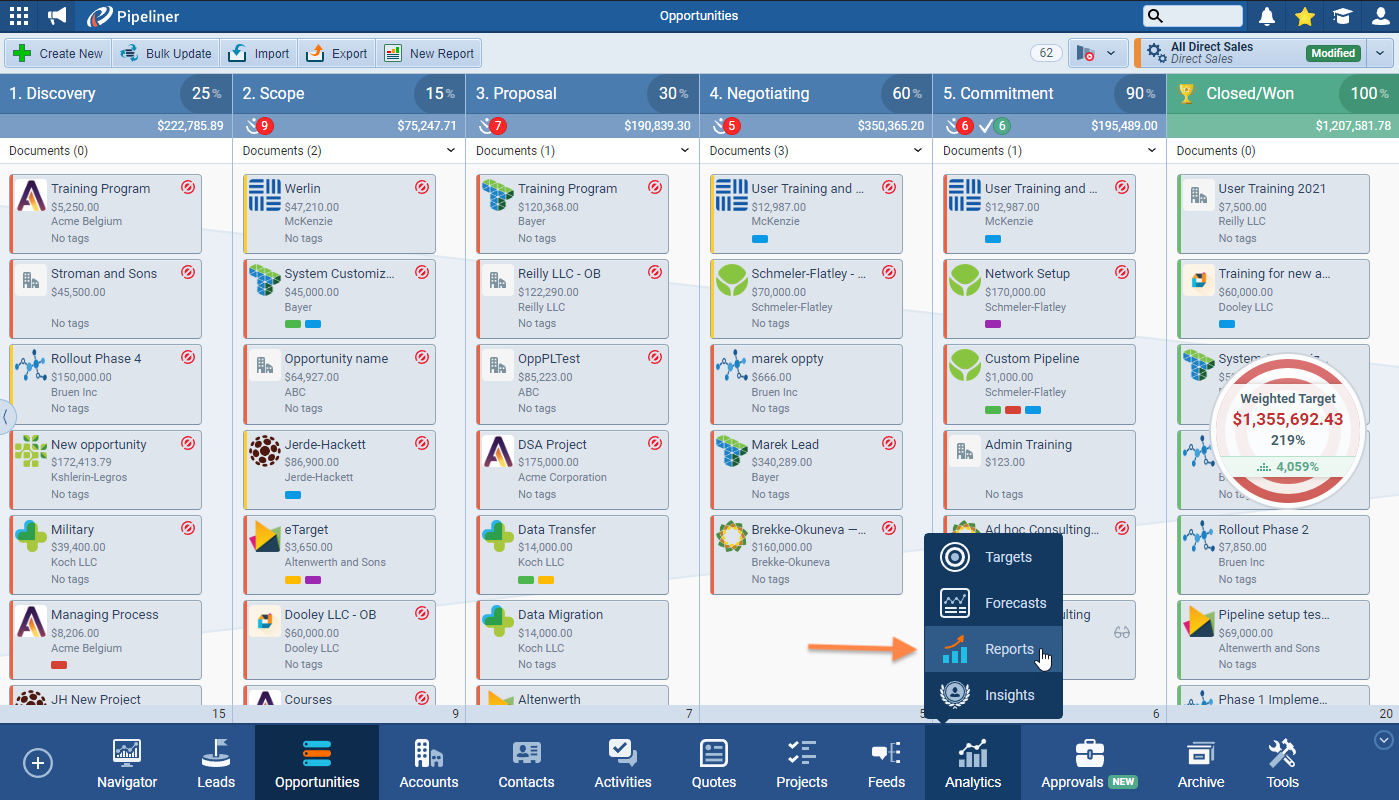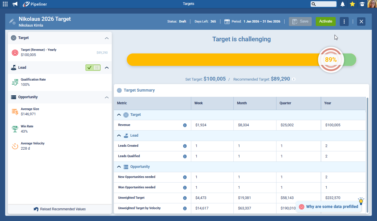 - Unified Vision (Navigator Dashboard): Your progress isn’t just stuck in the Pipeline View. The Target element is prominently displayed on the Navigator Dashboard, providing leadership and users with an instant, high-level snapshot of goal attainment upon login.