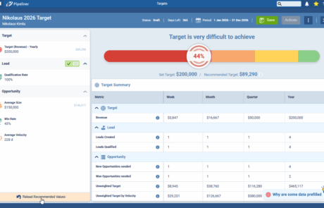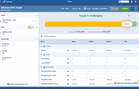 The Dynamic Target is your real-time performance tracker that shows you exactly how close you are to achieving your sales goals. It is constantly visible on the right side of the screen within the Pipeline View, providing an always-on, up-to-the-minute reflection of your progress. It eliminates the need for manual reports and outdated dashboards.