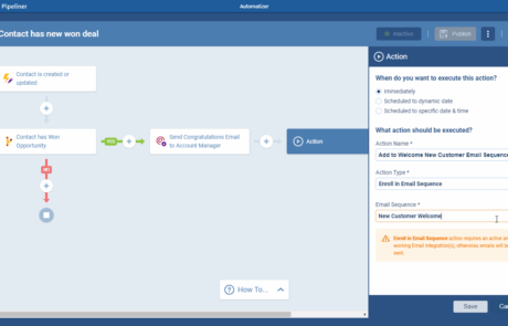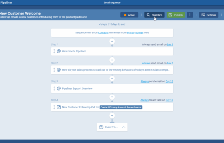 Seamless OnboardingOnboarding Onboarding is the process or act of introducing a new customer to your product or service; or integrating a newly hired employee into your workforce or team. The sale isn’t the end of the journey; it’s the beginning. Upon closing a deal, automatically enroll the Primary Contact into a “Welcome” sequence. This series can deliver training materials, introduce the accountAccount Account refers to a record of primary and background information about an individual or corporate customer, including contact data, preferred services, and transactions with your company. management team, and set expectations for the first 30 days, ensuring immediate customer satisfaction.