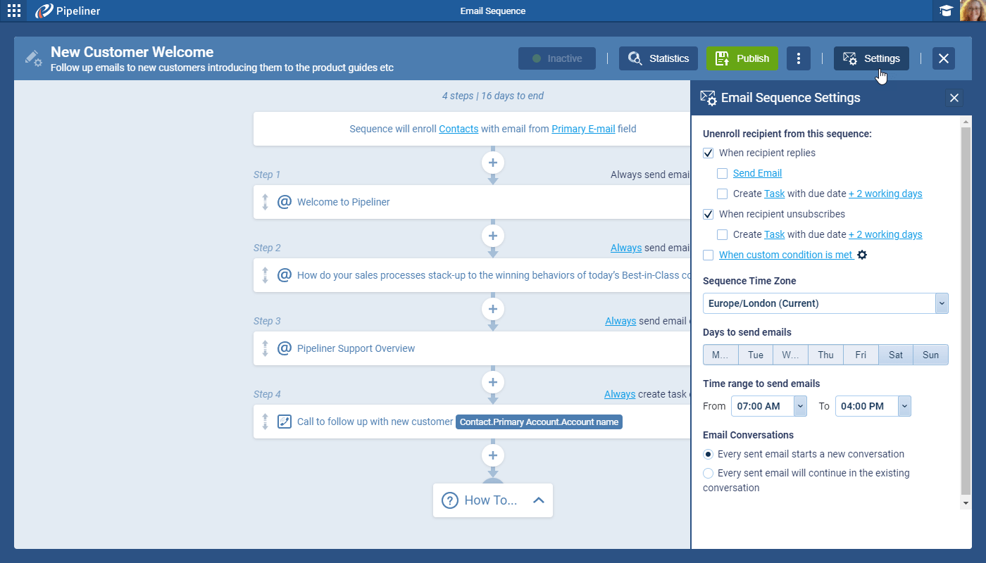 - Auto-Enrollment: Automatically enroll leads into a sequence when they enter a specific pipeline stage or when a new record is created.