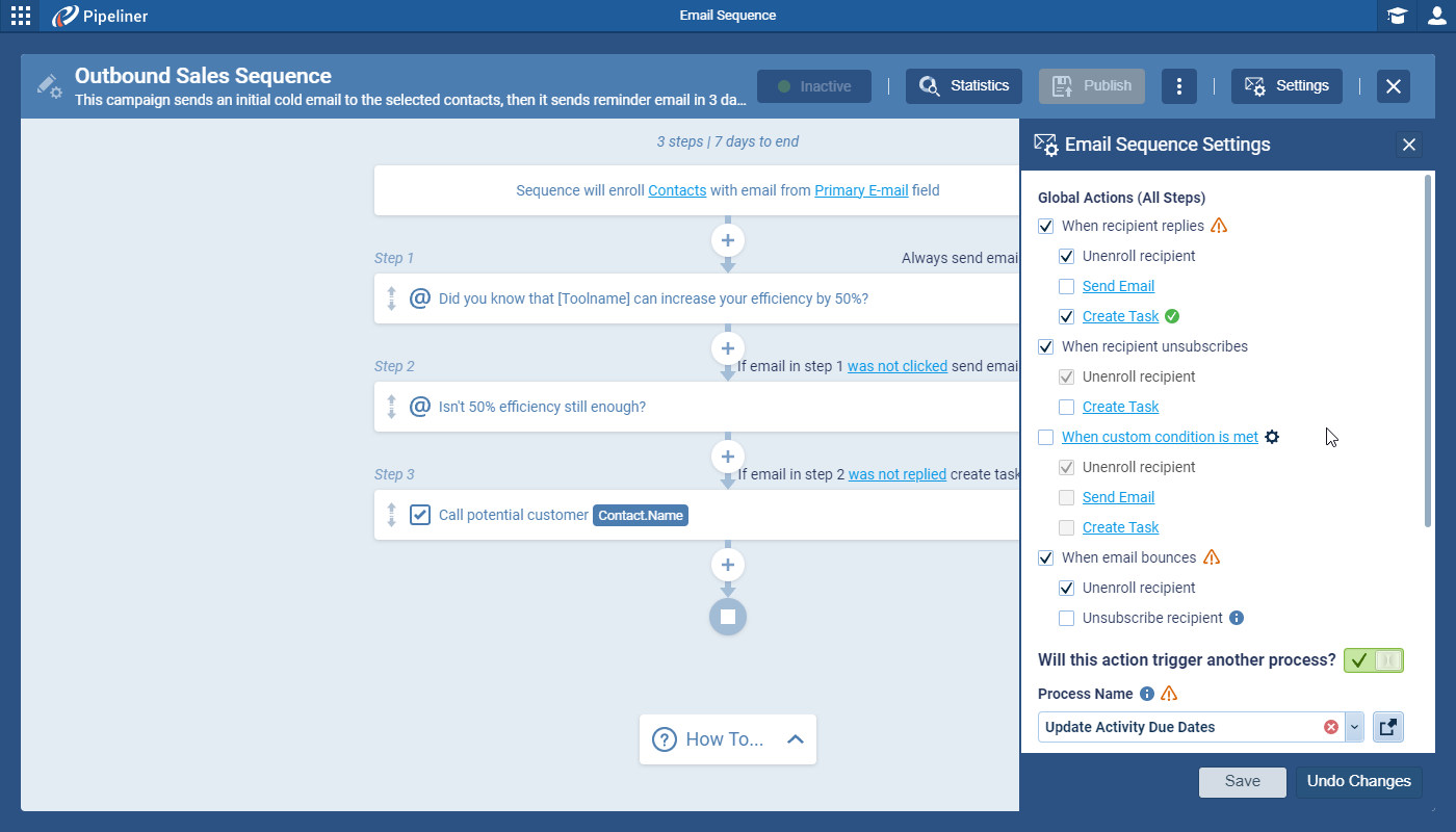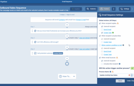 - Multi-Channel Tasks: It’s not just about email. You can program the sequence to create CRM Tasks for the record owner. For example, if a prospect clicks a link in Email #3, the system can automatically assign a “Call LeadLead Lead refers to a prospect or potential customer (who can be an individual or organization) that exhibits interest in your service or product; or any additional information about such entity.” task to your sales rep.