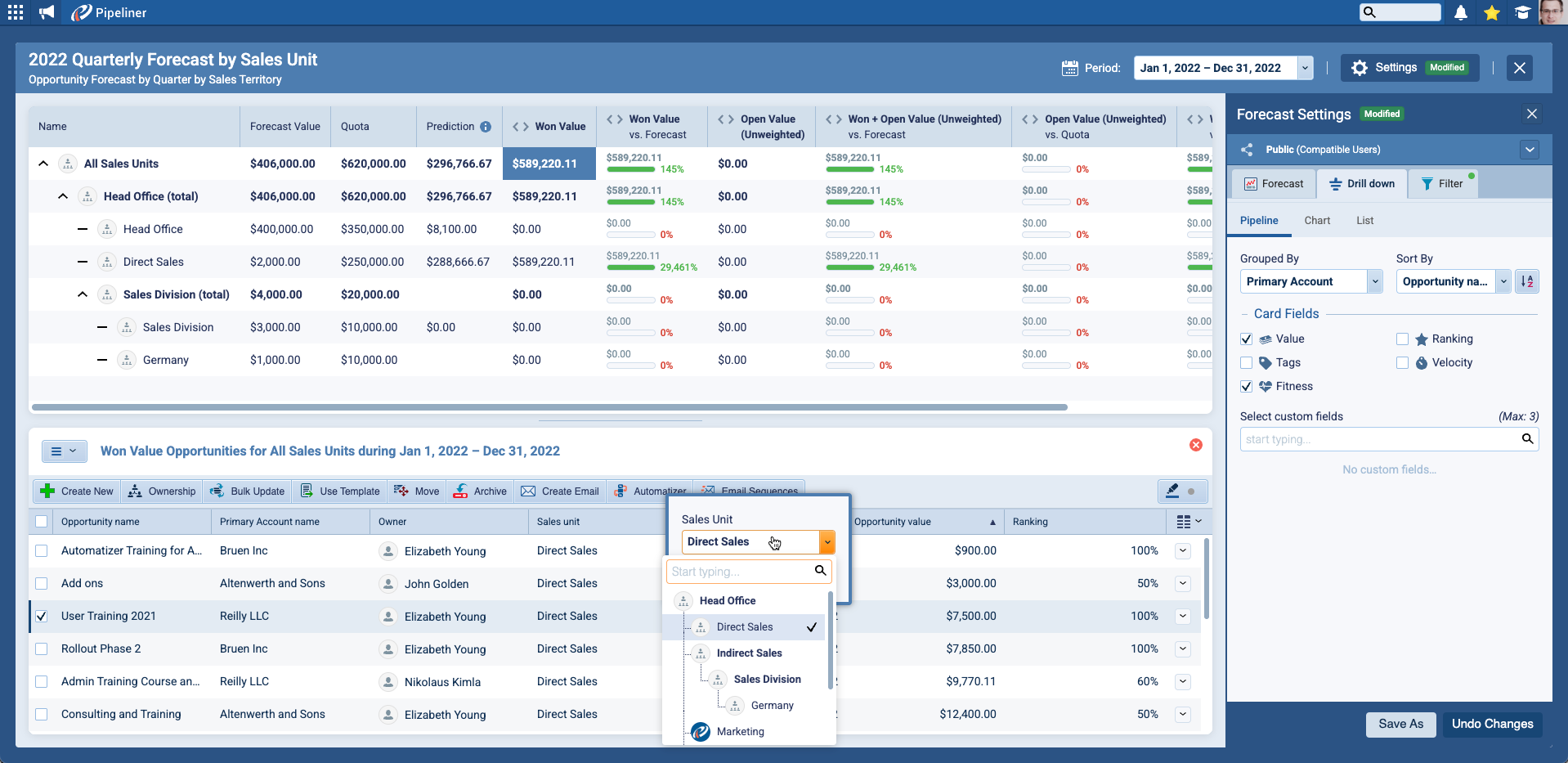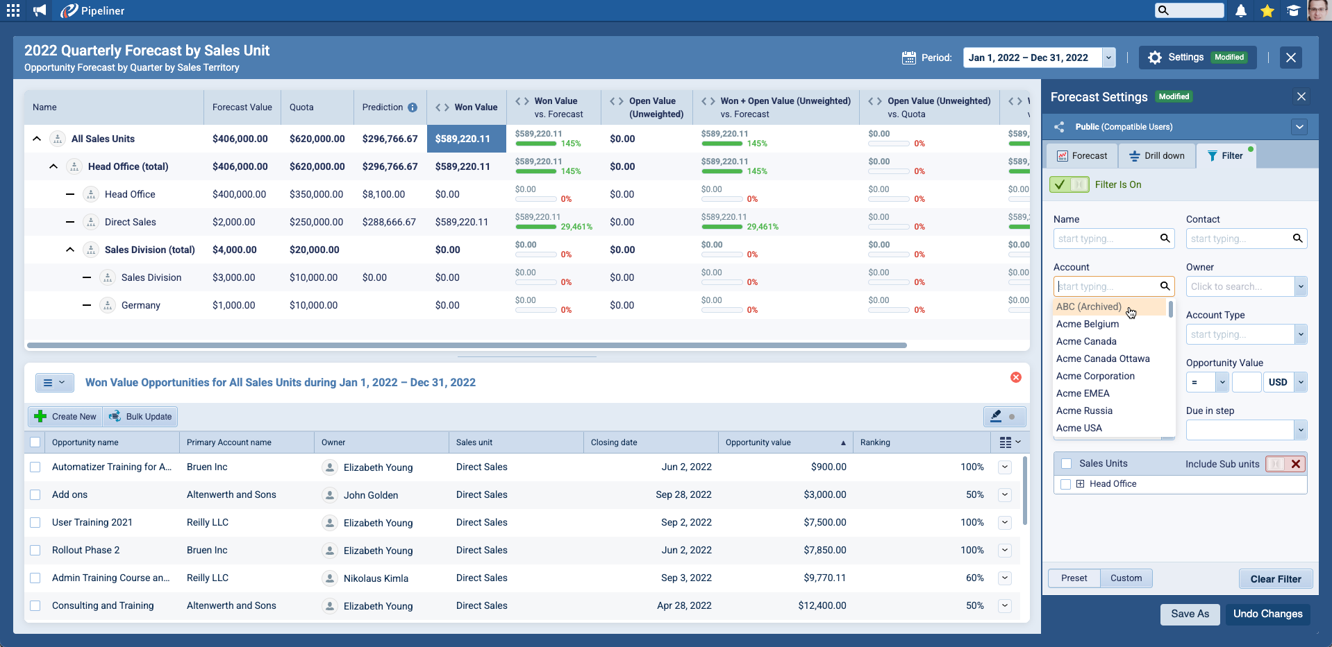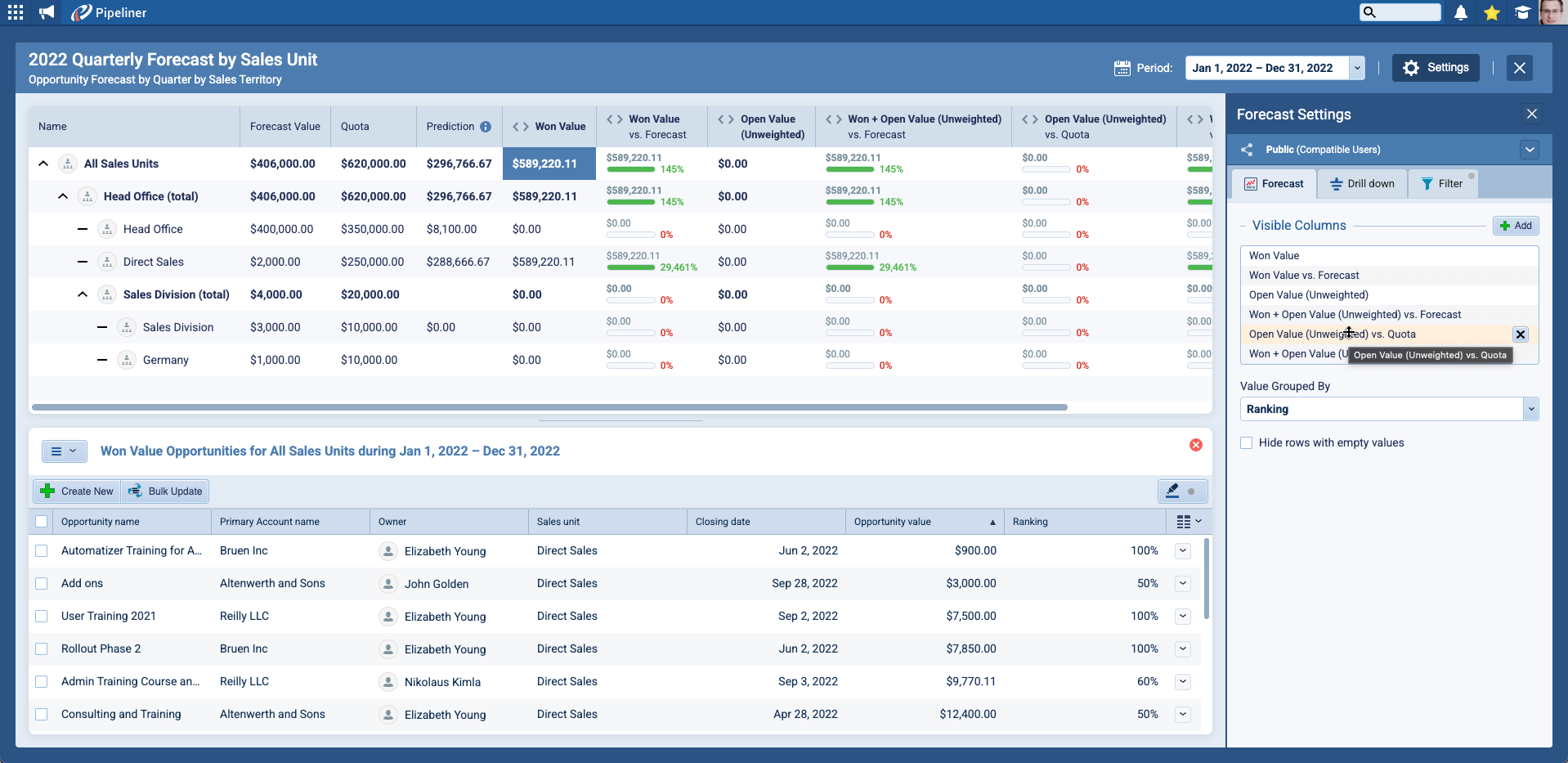 - Customizable Forecast Metrics: Beyond Opportunity Value, forecast by count, quantity, or unique non-currency units.