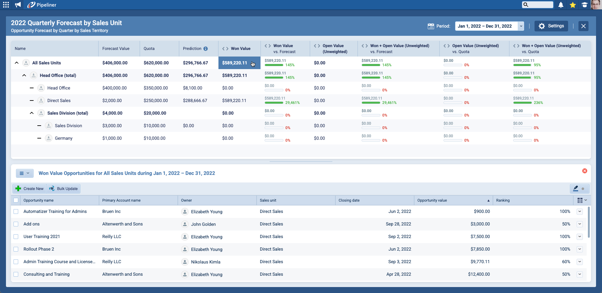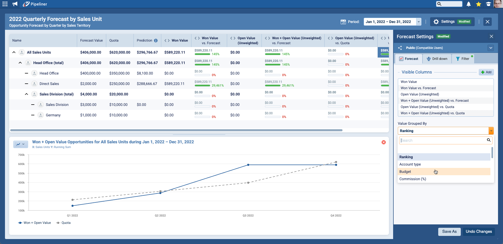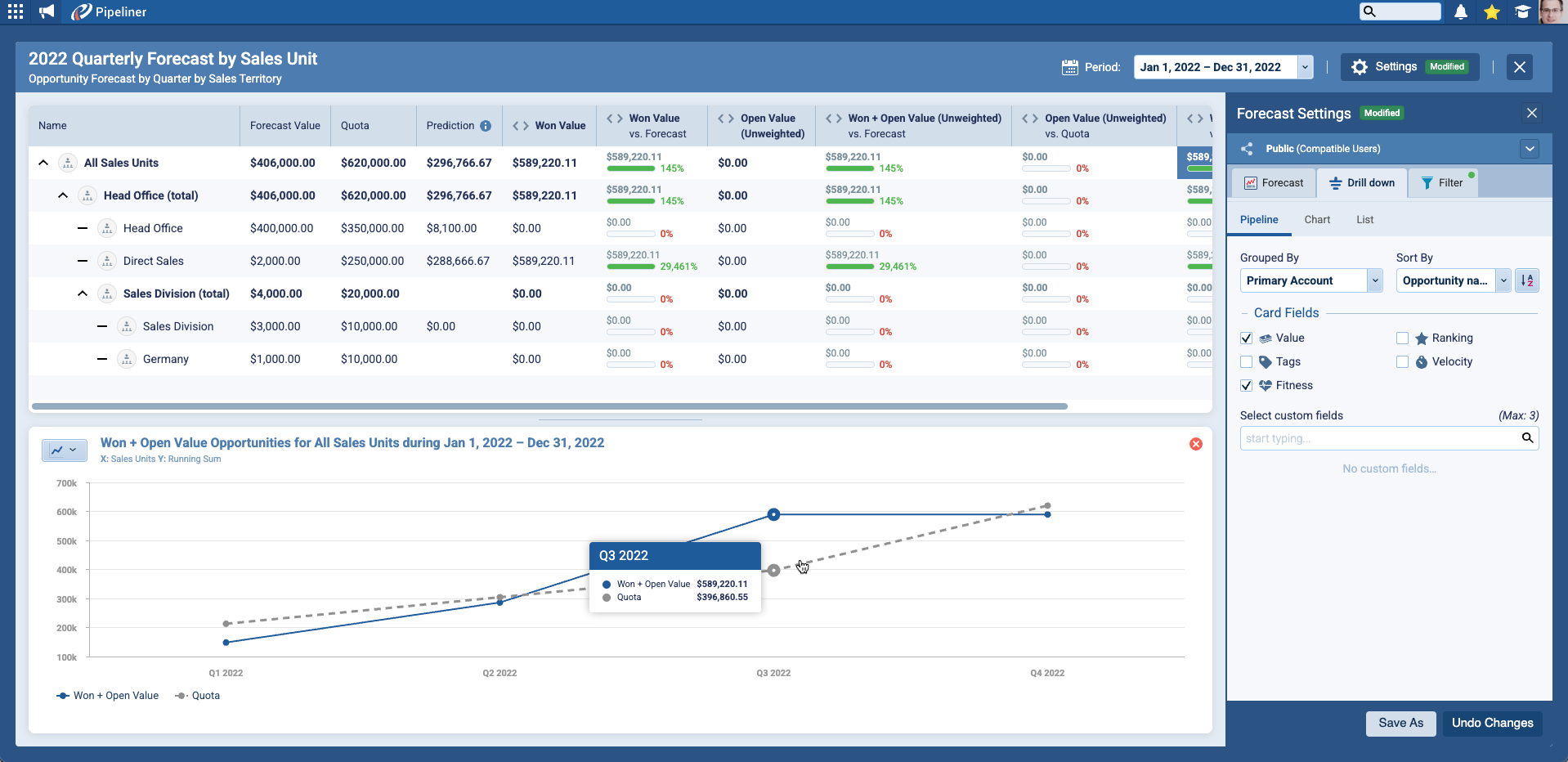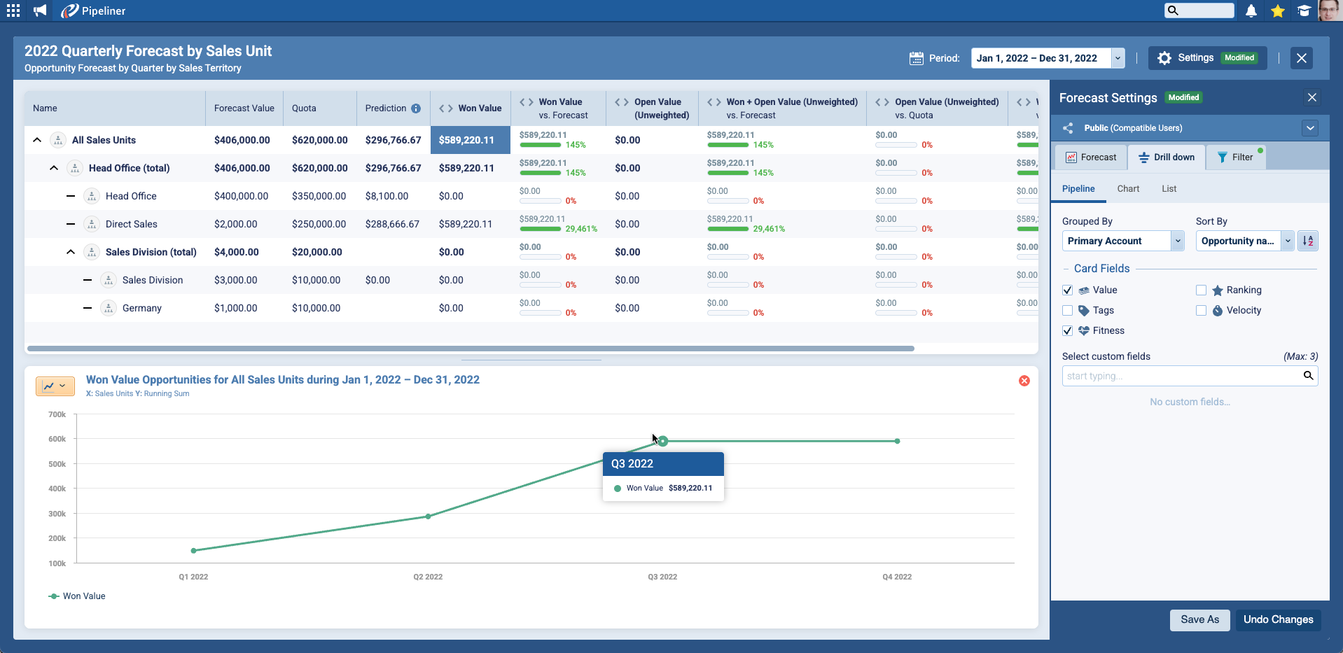 - Customizable Forecast Metrics: Beyond Opportunity Value, forecast by count, quantity, or unique non-currency units.