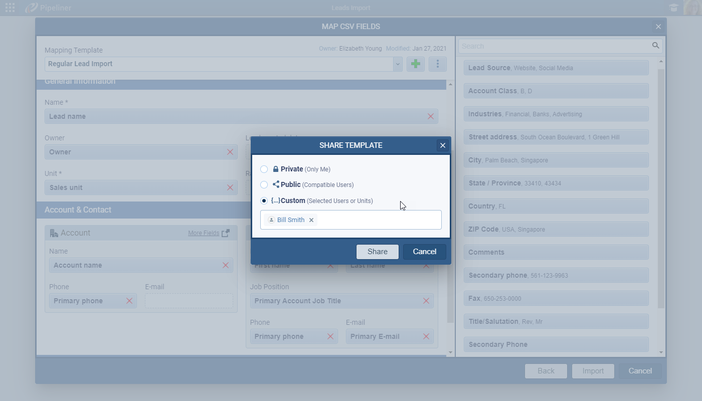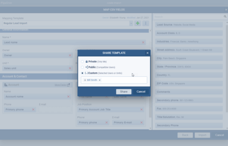 - Share and Standardize: Templates can be shared with other users across your organizationOrganization Organization is a cohesive group of people working together and formally bound by a shared identity (e.g., one team, company, club, etc.) and a common purpose (e.g., business growth, athletic victory, etc.)., ensuring data consistency and process standardization, critical for large sales teams and global operations.