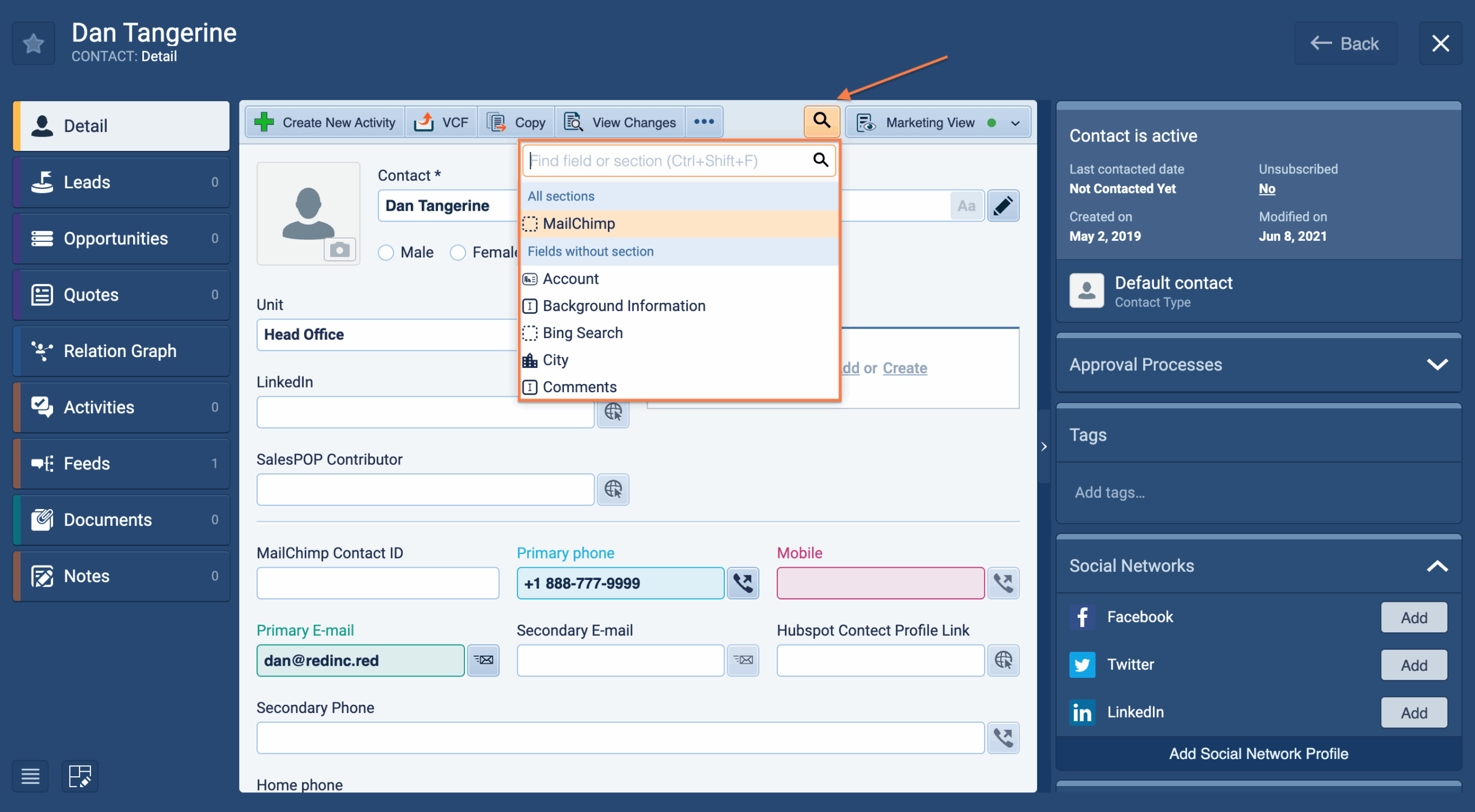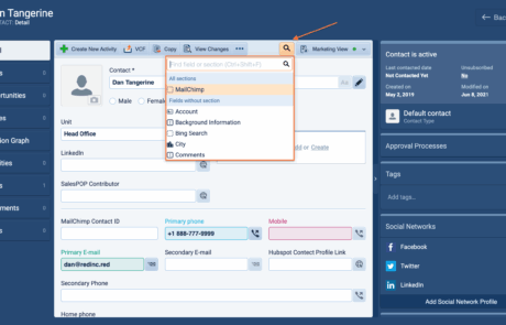 - What happens: A search bar appears. Start typing the name of the field or section you need (e.g., “Mobile Phone” or “Invoicing”).