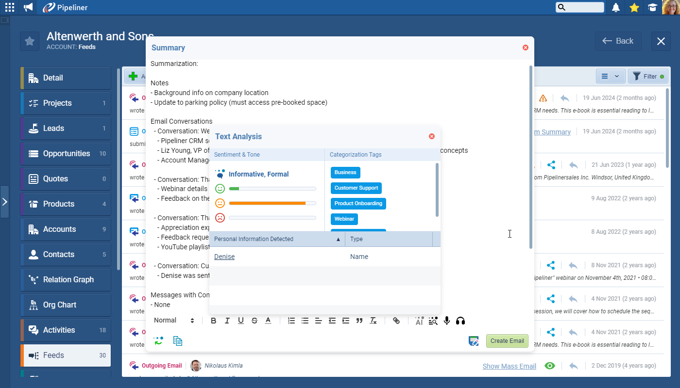 What It Does: Words carry emotion, and Voyager AI reads between the lines. The Sentiment Analysis feature examines your communications and reveals the overall sentiment (positive, negative, or neutral), the emotional tone of customer messages, shifts in sentiment over time, and warning signs that might indicate deal risk.