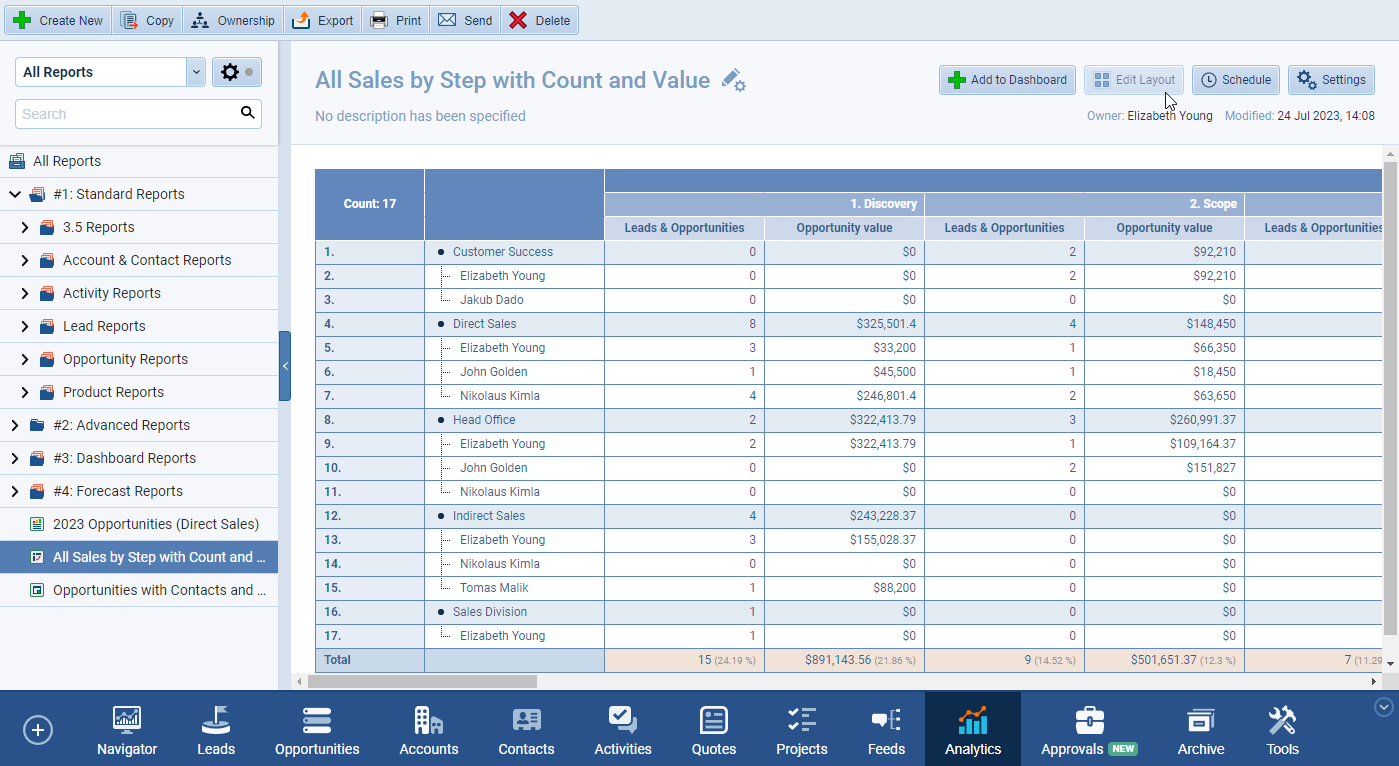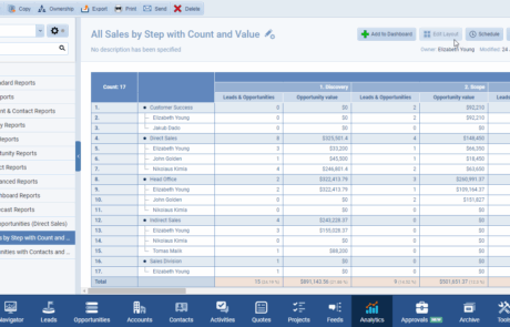 Instantly see the ‘count of’ and ‘sum of values’ for Opportunities, broken down by Sales Step and Industry. No more manual lookups or complicated spreadsheet formulas—the answer is right there. You can simplify complex analysis by using drag-and-drop fields, instantly creating multi-dimensional reports without writing a single line of code.