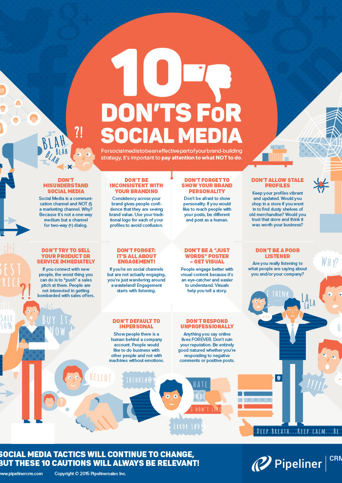 This poster covers the top 10 things you want to avoid when using social media to put your brand forward.
