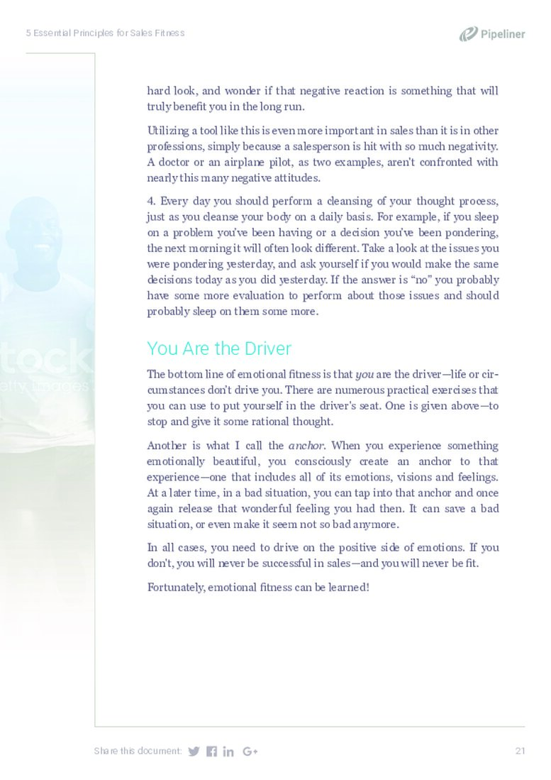Emotional fitness is important for anyone, but is crucially important for a salesperson. Something like 90 to 95 percent of the interactions a salesperson has are negative. Phone calls and emails are ignored. Gatekeepers furiously protect decision makers. Many have a 5 to 10 percent closing ratio. There is even constant resistance to prospecting.