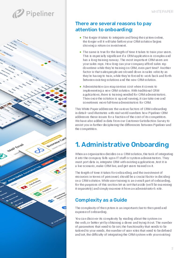 There are many issues to take into accountAccount Account refers to a record of primary and background information about an individual or corporate customer, including contact data, preferred services, and transactions with your company. when choosing a CRM solutionSolution Solution is a combination of ideas, strategies, processes, technologies and services that effectively helps an organization achieve its goals or hurdle its challenges.. But chief among these considerations should be onboarding—that is, how easy is it to implement, train your users on, and administrate your new CRM solution?