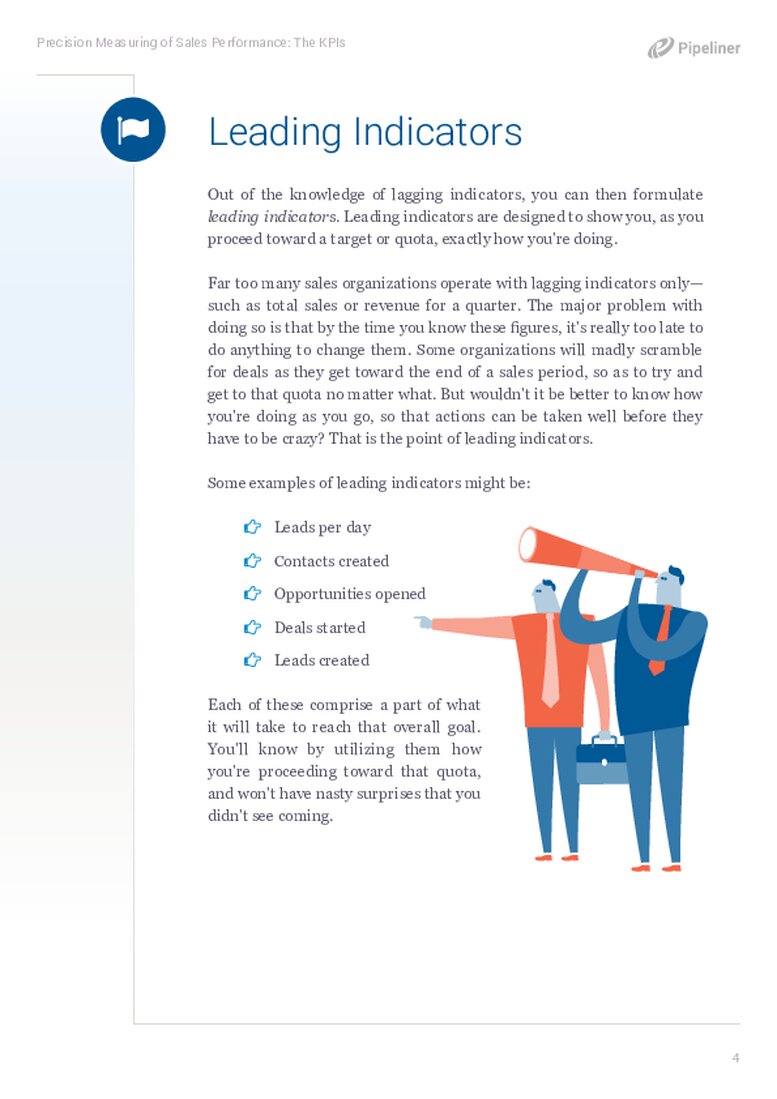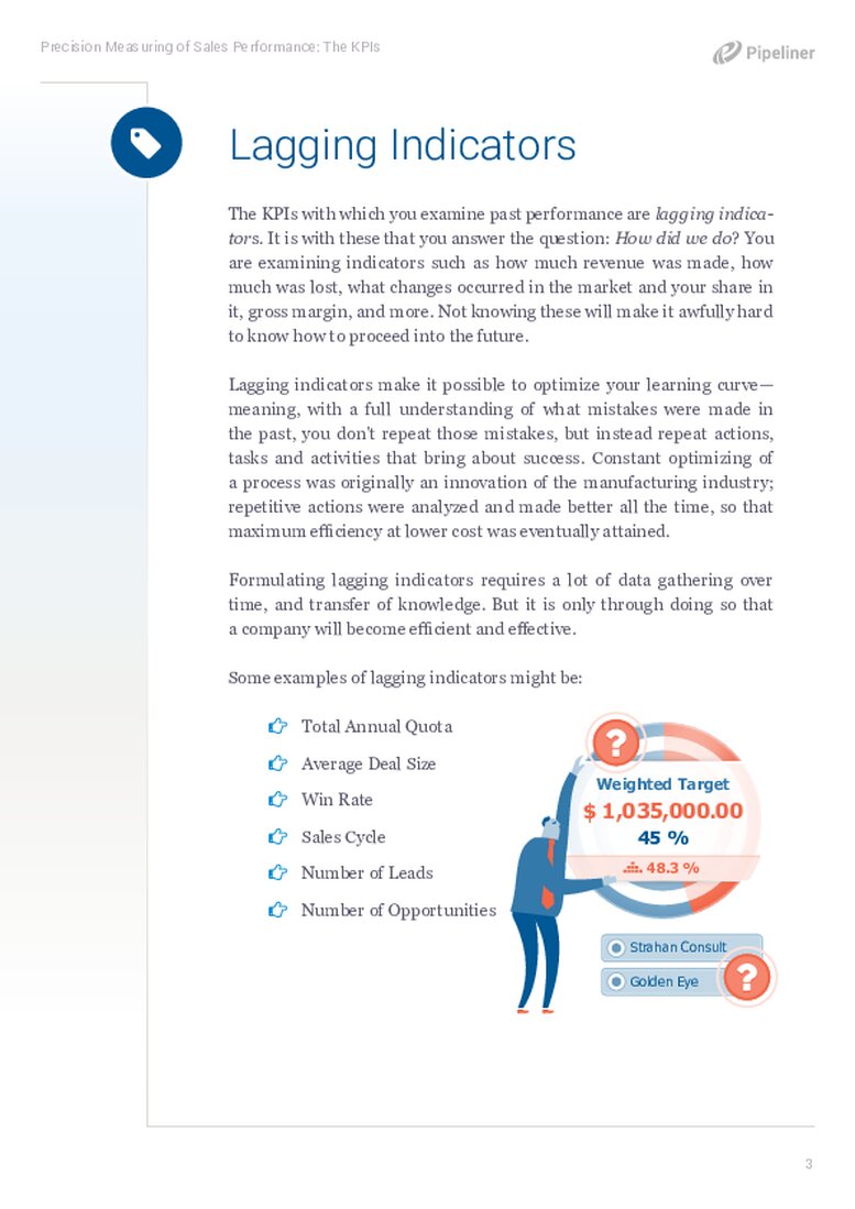 - Leading Indicators: Out of the knowledge of lagging indicators, you can then formulate leading indicators. Leading indicators are designed to show you, as you proceed toward a target or quotaQuota Quota is a predefined benchmark indicating the amount of sales a selling unit such as a sales rep or a regional sales team should achieve within a given period, often used as a measure of success, performance and eligibility for commissions and other rewards., exactly how you’re doing.