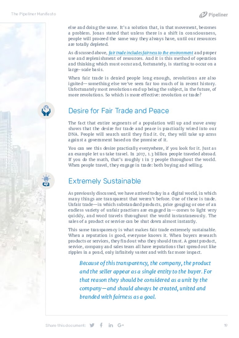 You might notice that today there is a great amount of attention not just on trade, but on fair trade. Fair trade would mean honesty—fairness to people purchasing the product or service, and fairness within the marketplace. But it also includes fair wages to the employees of producers and benefits to the environment in which products are produced. Using this standard, you can see how vitally important fair trade is in today’s world, in which not only war is a threat, but also environmental ruin and depletion of resources.