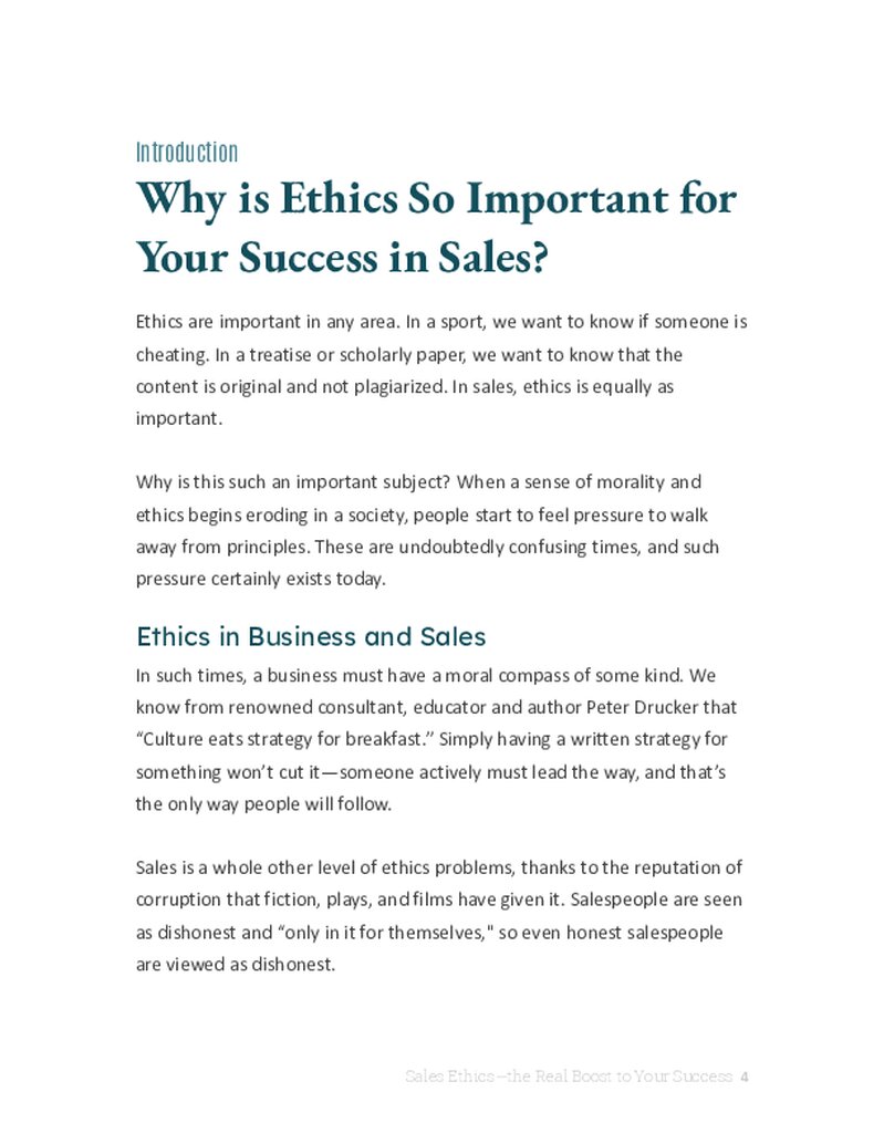 Ethics are essential in any field, including sports and academia. A lack of ethics can leadLead Lead refers to a prospect or potential customer (who can be an individual or organization) that exhibits interest in your service or product; or any additional information about such entity. to a breakdown of principles and open the door to all kinds of misconduct. In sales, this is a particular problem due to a reputation for corruption portrayed in the media, which makes even honest salespeople seem dishonest. The author contends that without a moral compass, a business’s written strategy won’t work, and people will not follow the leadership. Widespread doubt, which comes from an unreliable sales force, can lead to other problems as people rationalize their dishonest behavior by pointing to the lies of others. The ebook asserts that it is crucial to face this reality and not be naive about the current state of business ethics.