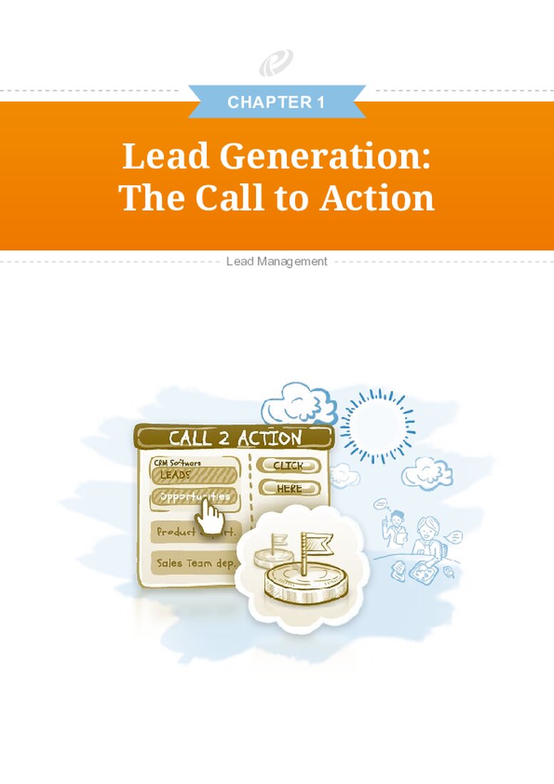 Chapter 1: Lead GenerationLead Generation Lead Generation is a set of activities aimed at generating interest around a product or service through methods such as 1. content marketing (blogging, podcasts, free downloads); 2. advertising (PPC, banner ads, Yellow Pages, sponsoring an event); 3. referrals (recommendations from existing customers and other people); 4. outbound marketing (cold email, cold calling), and 5. partnerships (joint ventures, affiliate marketing).: The Call to Action