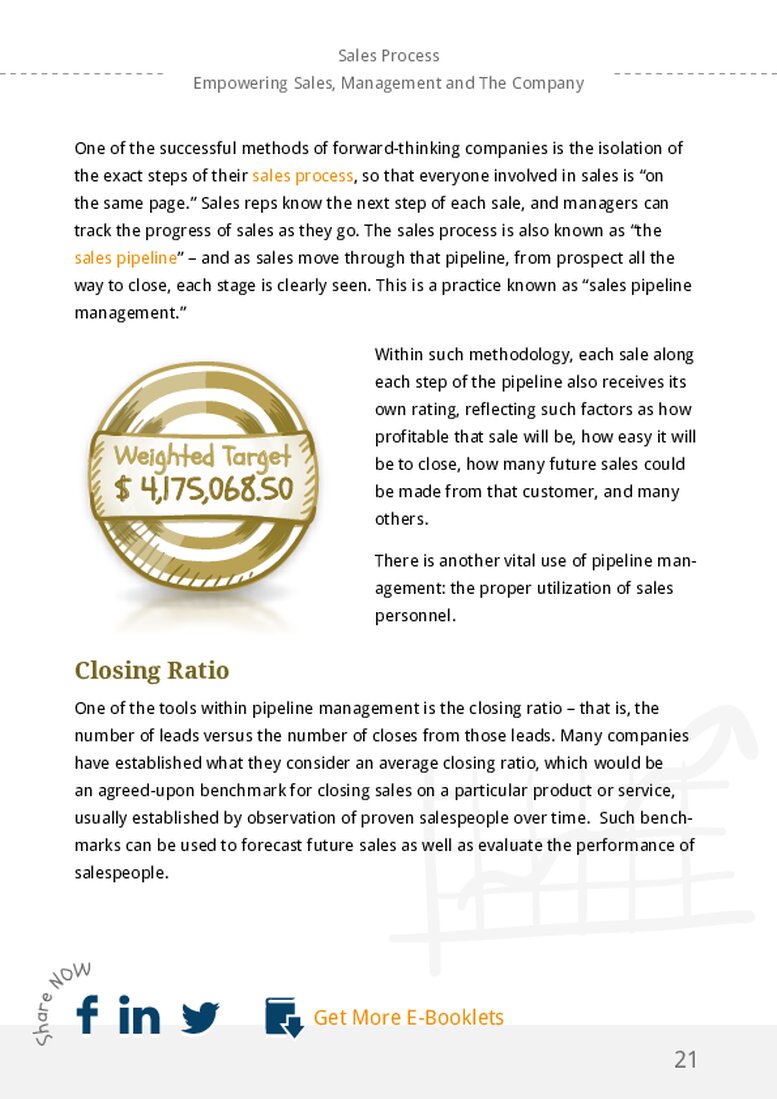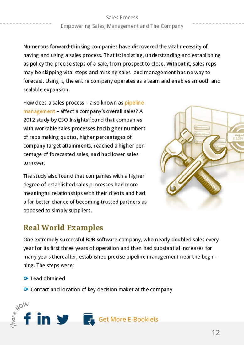 How does a sales process – also known as pipeline management – affect a company’s overall sales? A 2012 study by CSO Insights found that companies with workable sales processes had higher numbers of reps making quotas, higher percentages of company target attainments, reached a higher percentage of forecasted sales, and had lower sales turnover.