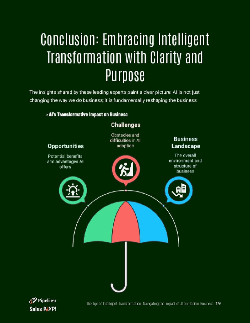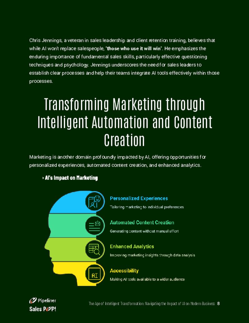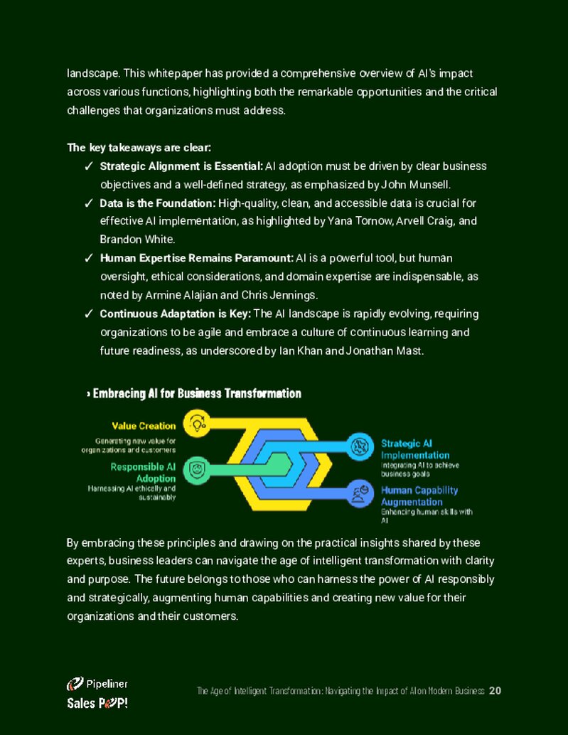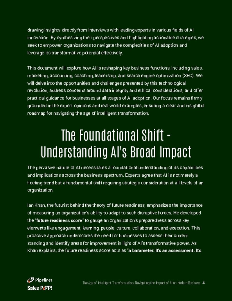 The contentContent Content refers to a material or document released in various forms (such as text, image, audio, and video) and created to inform, engage or influence specific audiences. explores the foundational shift AI represents, moving beyond a fleeting trend to a fundamental change that requires strategic consideration at every level of an organizationOrganization Organization is a cohesive group of people working together and formally bound by a shared identity (e.g., one team, company, club, etc.) and a common purpose (e.g., business growth, athletic victory, etc.).. The whitepaper delves into the specific ways AI is reshaping key business functions, including sales, marketingMarketing Marketing is the field, set of actions, or practice of making a product or service desirable to a target consumer segment, with the ultimate aim of effecting a purchase., accounting, coaching, and leadership. It examines the revolution in sales through intelligent tools, the transformation of marketing via automation, and the enhancement of back-office efficiency in accounting and operations. Furthermore, the guide addresses the critical challenges of AI adoption, such as dataData Data is a set of quantitative and qualitative facts that can be used as reference or inputs for computations, analyses, descriptions, predictions, reasoning and planning. integrity, security, ethics, and the necessity of human expertise alongside automated systems. Ultimately, it looks toward the future landscape, offering strategic imperatives for businesses to embrace intelligent transformation with clarity and purpose, ensuring they are well-positioned for sustainable growth.