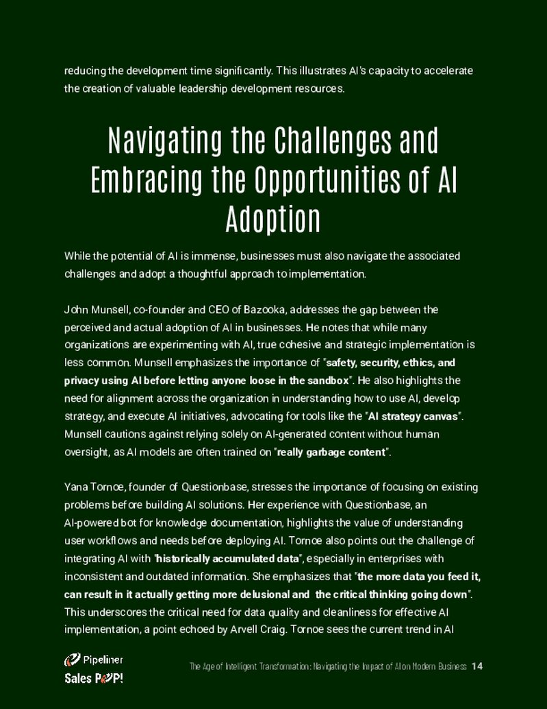 - Navigating the Challenges and Embracing the Opportunities of AI Adoption. This section addresses the complexities of AI implementation, noting the gap between experimentation and actual strategic adoption. It highlights the critical need for safety, security, ethics, and privacy before wide-scale deployment. The text also discusses the challenges of data quality, as feeding AI more data can sometimes decrease critical thinking, and the importance of detecting AI-generated content to maintain integrity.