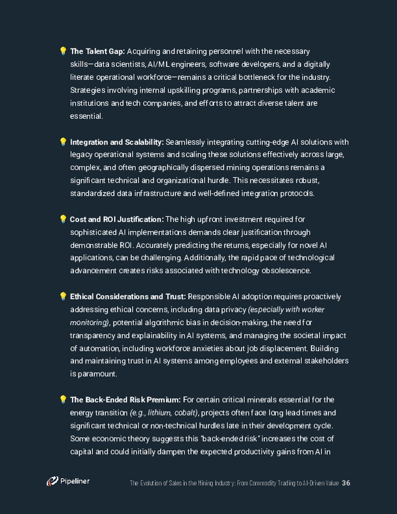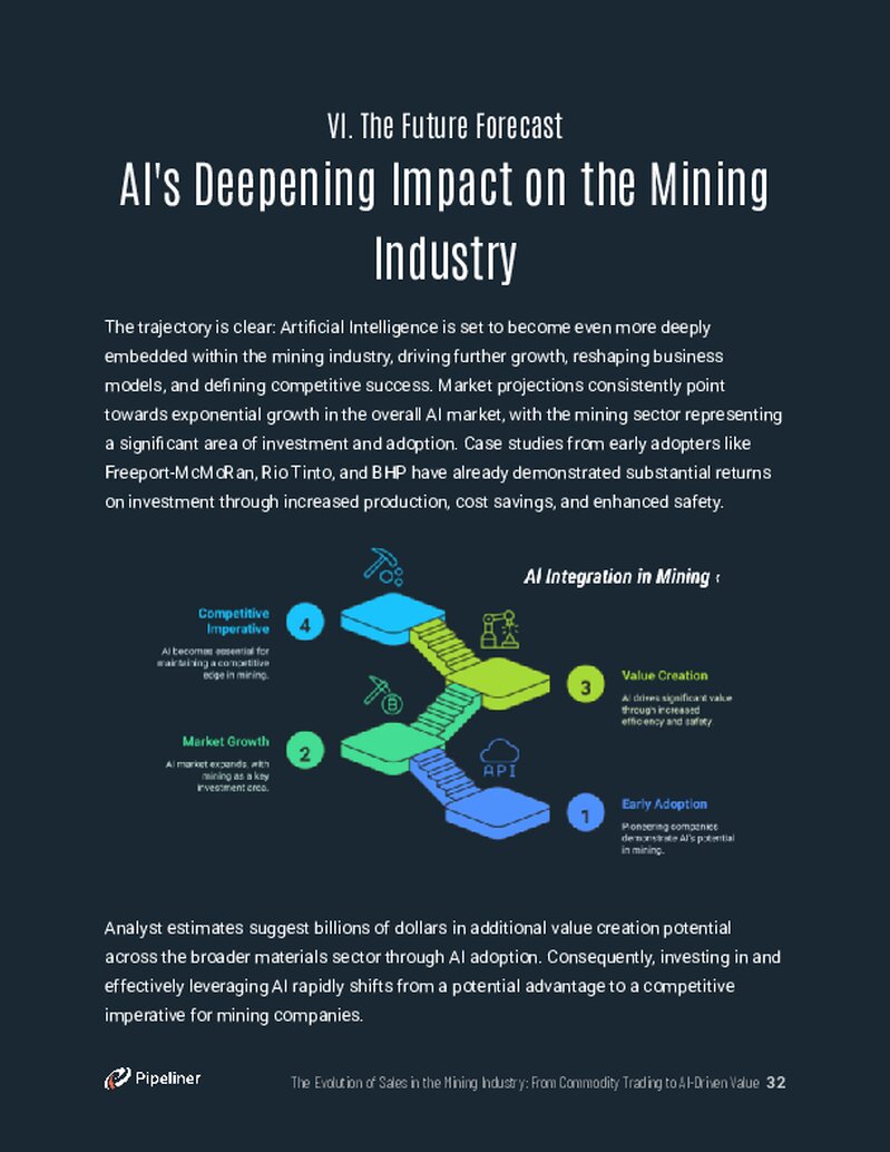 - VII. Conclusion: A Roadmap to an AI-Driven FutureThe ebook concludes with a set of clear, strategic imperatives for mining leaders. It provides an actionable roadmap for implementing a holistic AI strategy, investing in data infrastructure, and fostering a culture that can thrive in a new era of intelligent, data-driven sales.