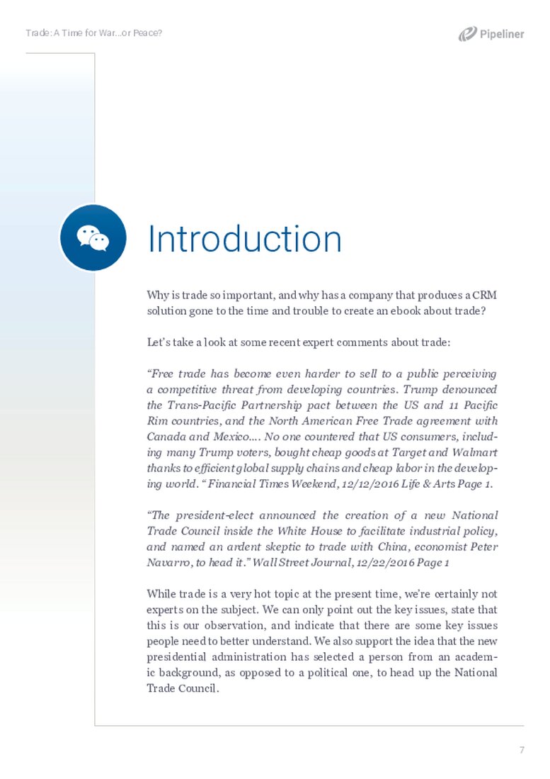 This chapter describes the ideal properties of the trade in the modern world, and stresses the importance of the business involvement in the formation of the trade agreements and the necessity of the global approach for companies and sales people. It reiterates the fact that trade is vital for economic development.