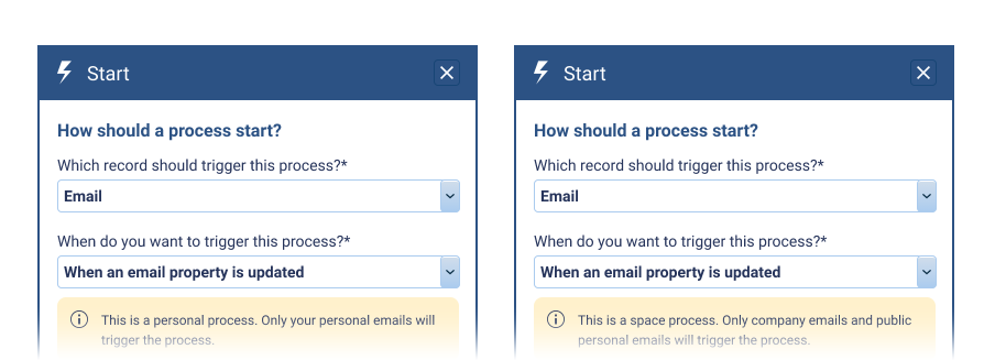 - Personal process – personal emails (both public and private) of the process owner will trigger the process