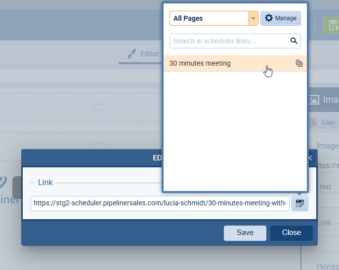 Users can use Buttons or Images to add links to Online Forms or Appointment Scheduler pages. Personalization is supported within the Link component.