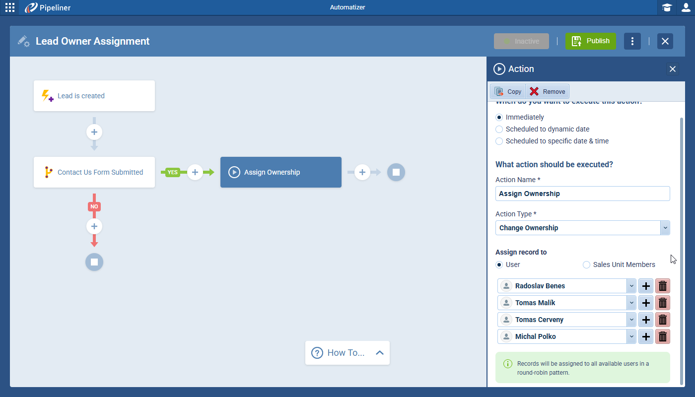 When triggered, this action will assign the triggered record to a new owner. If multiple users are selected, this action will assign new owners from all selected users in a round robin pattern.