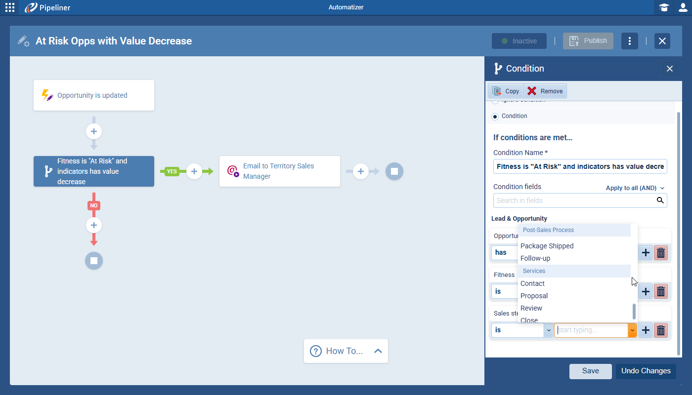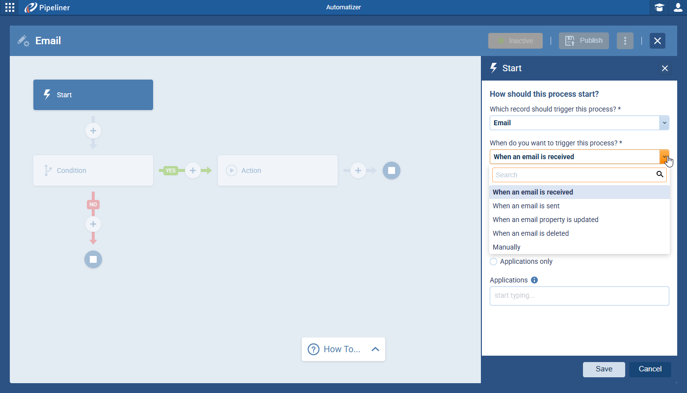 - When an email property is updated – supported email properties are Email Sentiment, Email Tag or Linked Records to an Email (this trigger applies only to existing emails and will not be triggered when a new email is received and AI subsequently evaluates the sentiment and tags)