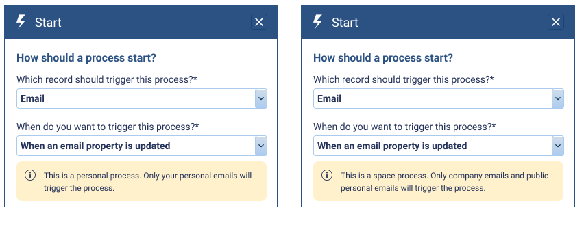 Users are notified about this difference via an infobox while setting up the email trigger. Note this does not apply to a Manual trigger – the user can trigger personal emails manually using a space process
