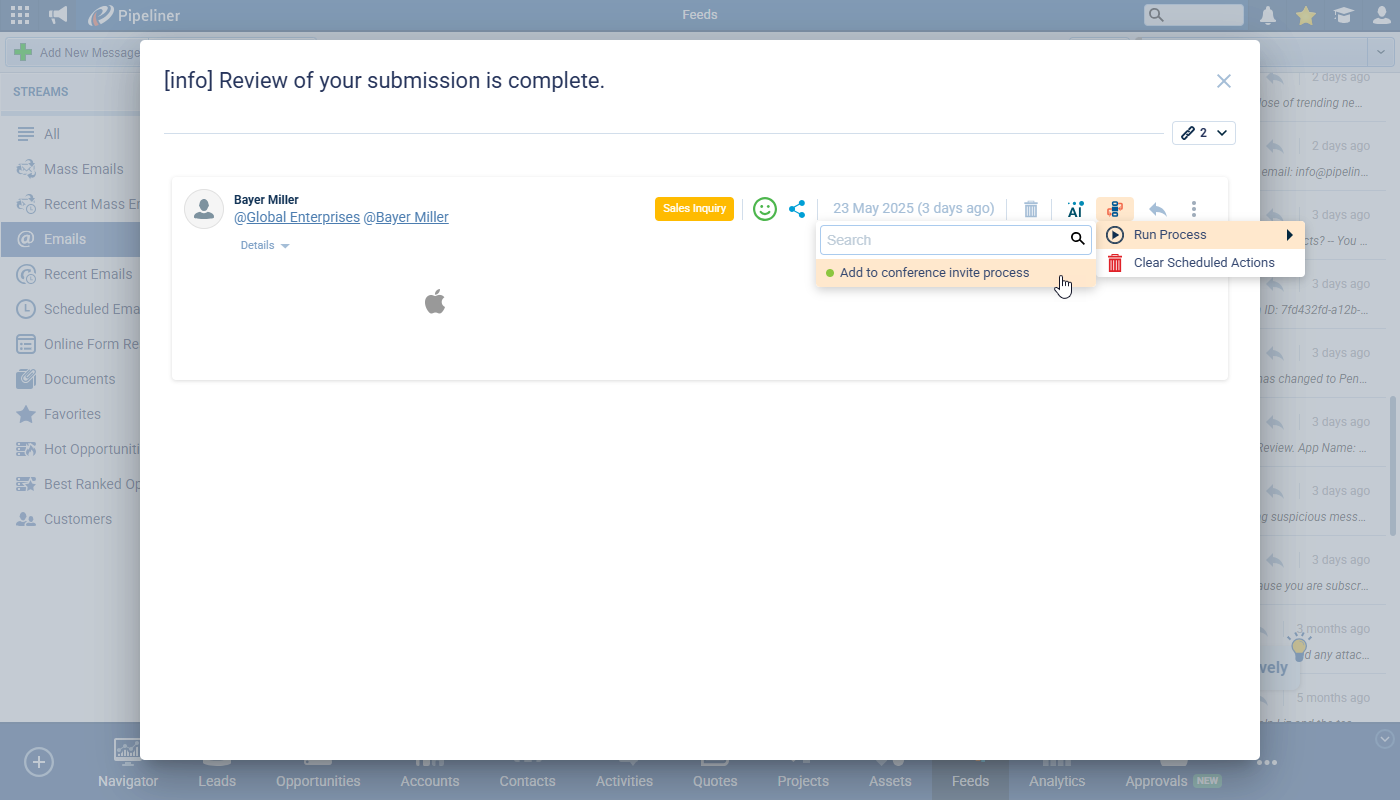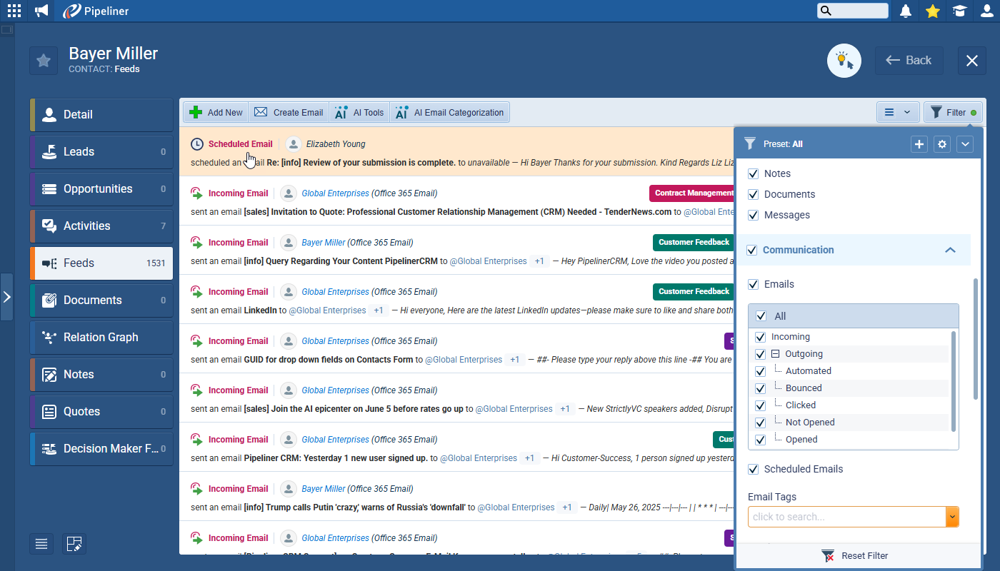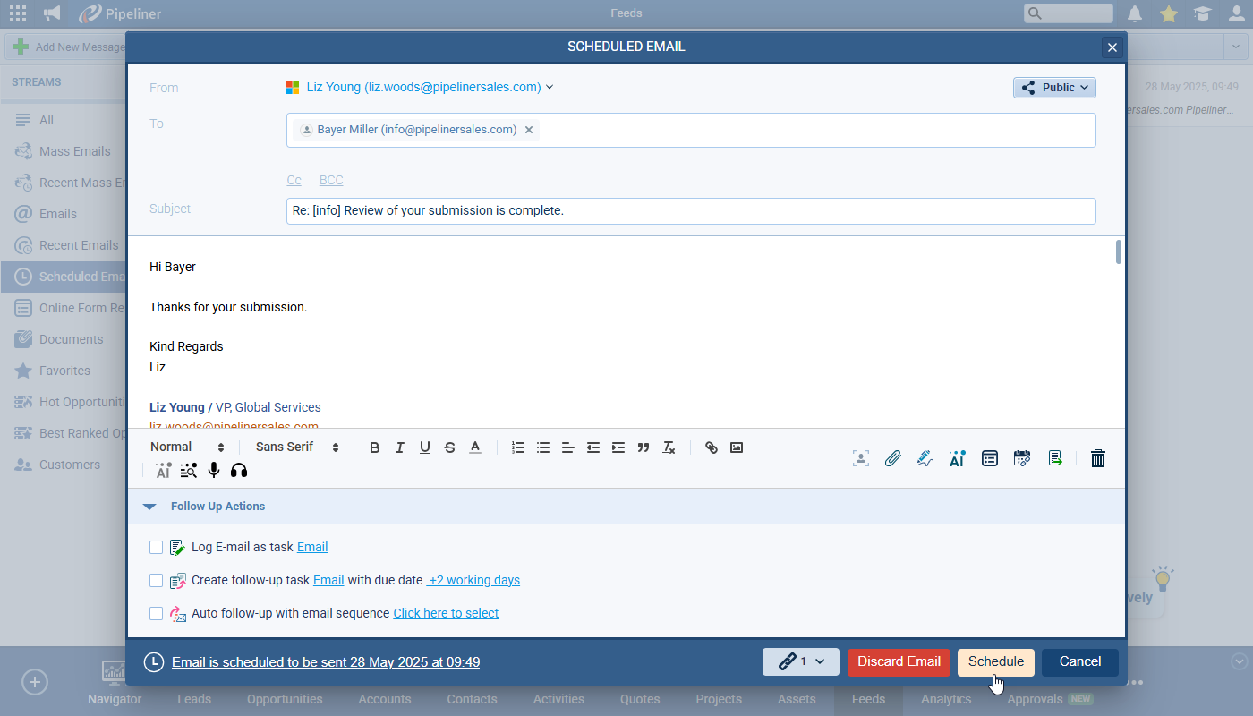 or in the Feeds of linked records. If “Scheduled Emails” is selected in Filter options, the scheduled emails will display at the top of the Feed and the scheduling can be edited and/or removed from here.