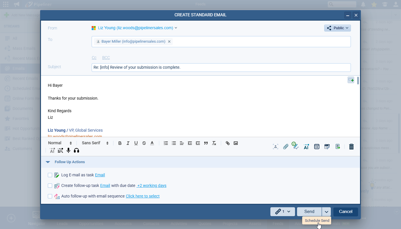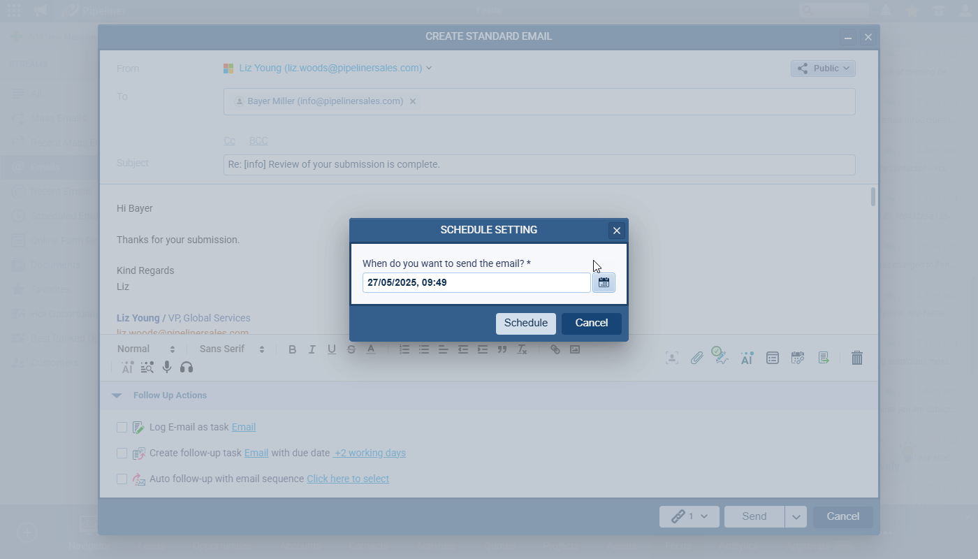 When a user is manually sending an email, there is now an option for them to send the email later using “Schedule Send”