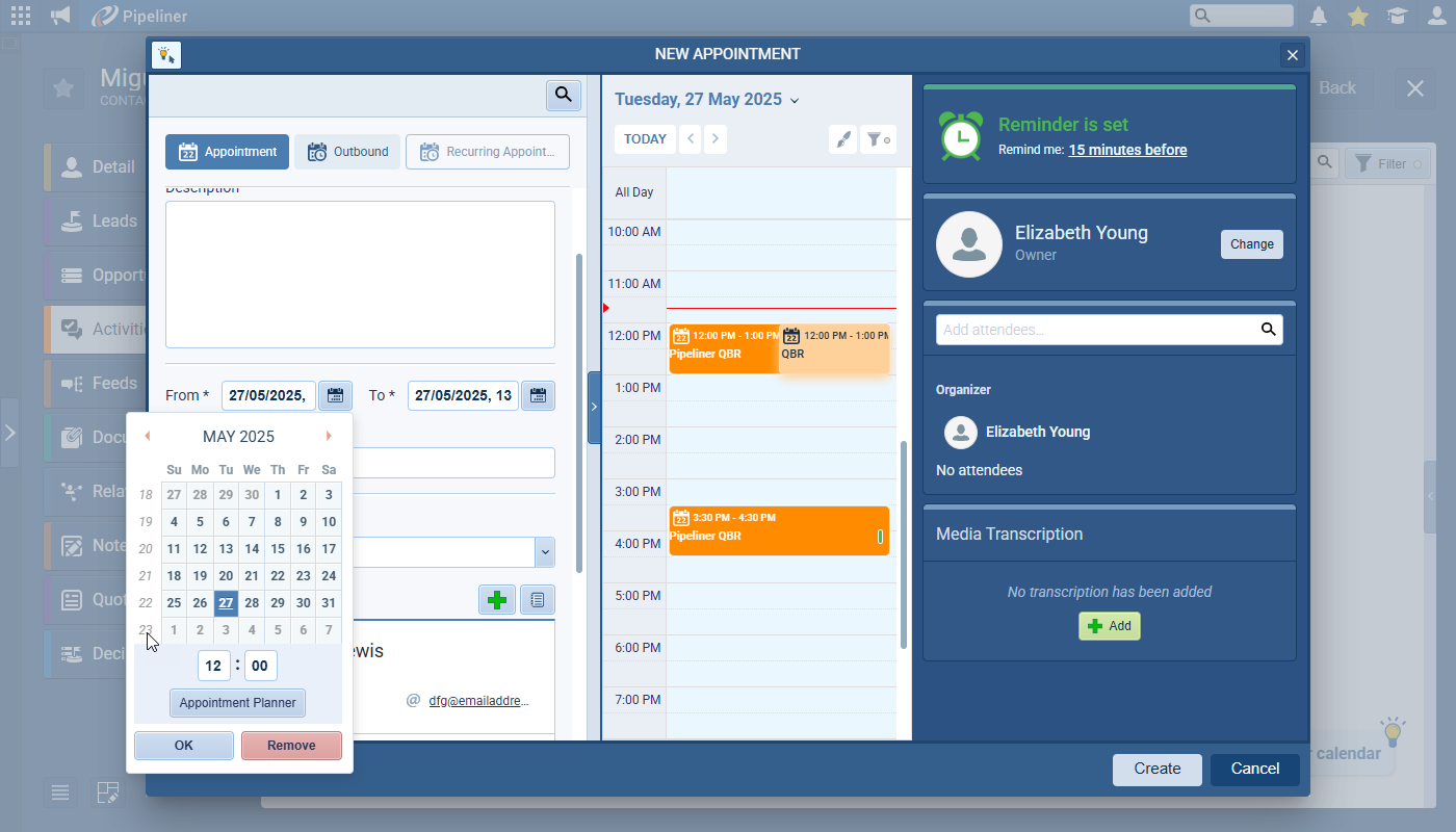 The user can select a date and time when they want the email to be sent. Note that this option does not apply to emails sent via Automatizer or from an Email Sequence – only “manually” sent emails.