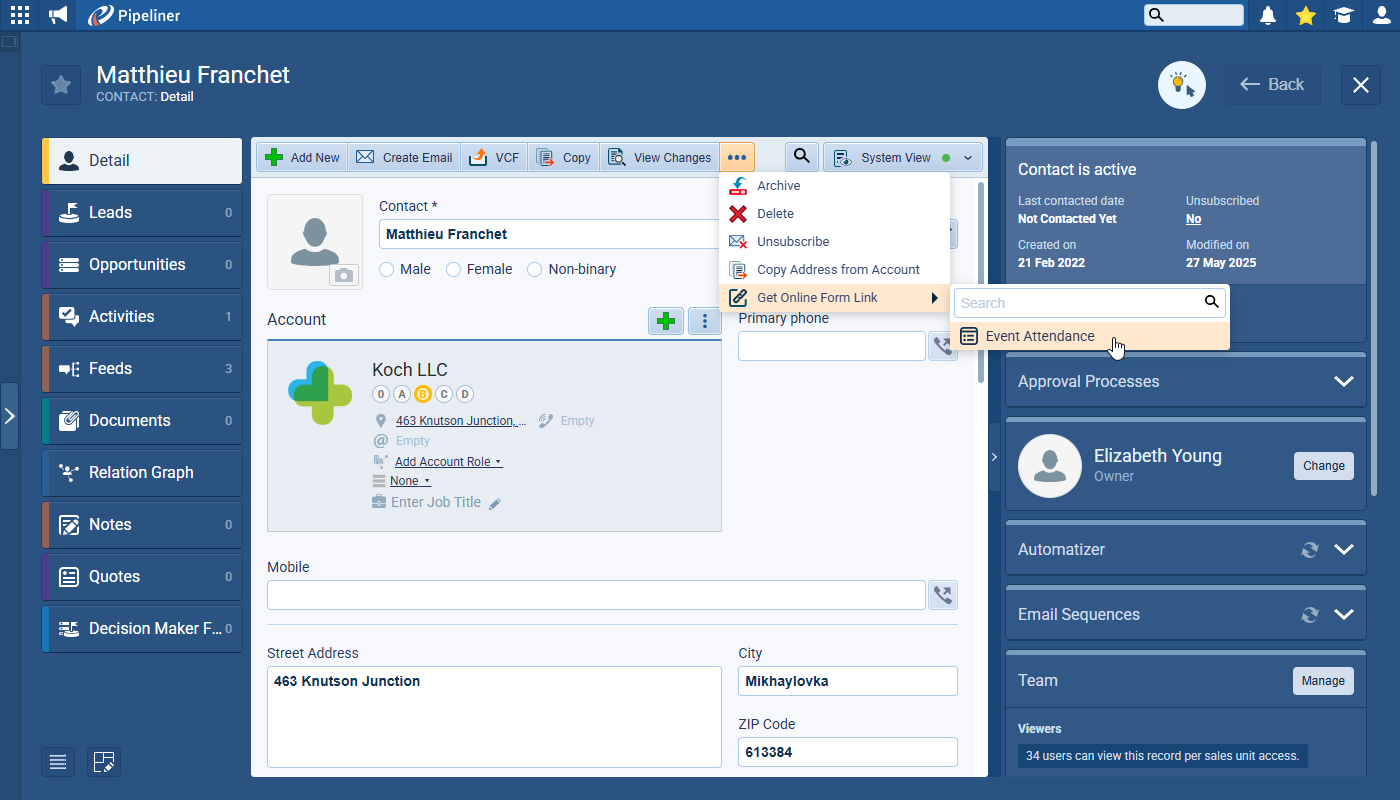 Users can now select and personalize an Online Form from an open record’s Detail page and copy the link. Using this option opens a list of currently active online forms from the same entity as the opened record. The user can select the relevant online form and quickly get a personalized link (for the opened record) that will be automatically copied to the clipboard