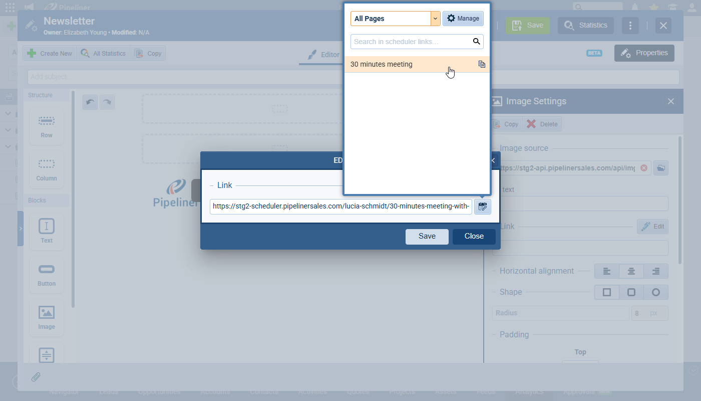 Users can use Buttons or Images to add links to Online Forms or Appointment Scheduler pages. Personalization is supported within the Link component.