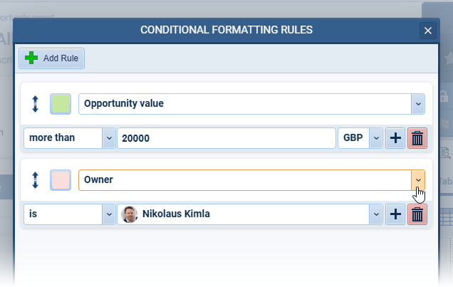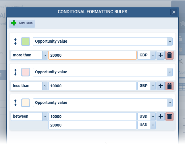 In Reports, users can now choose “Conditional Formatting” to color code each cell depending on how its value compares to the rule(s) that are set up. The example below fills the “Opportunity Value” field with a different colour depending on how large the value is ⤵
