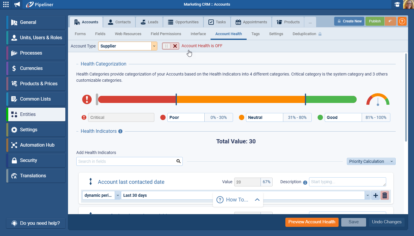 Account Health is an invaluable element of account management so we’ve added the option to have different account health settings per account type. “Account health” can be switched off per account type, so users don’t need to have account health calculated for all accounts — for example if a user wants to have account health set only for “key accountsKey Accounts Key Accounts are whale spenders or VIP customers prioritized by sales reps and customer success; churn from these clients would be a detrimental loss to the company’s revenue.” and not for “suppliers”. ⤵