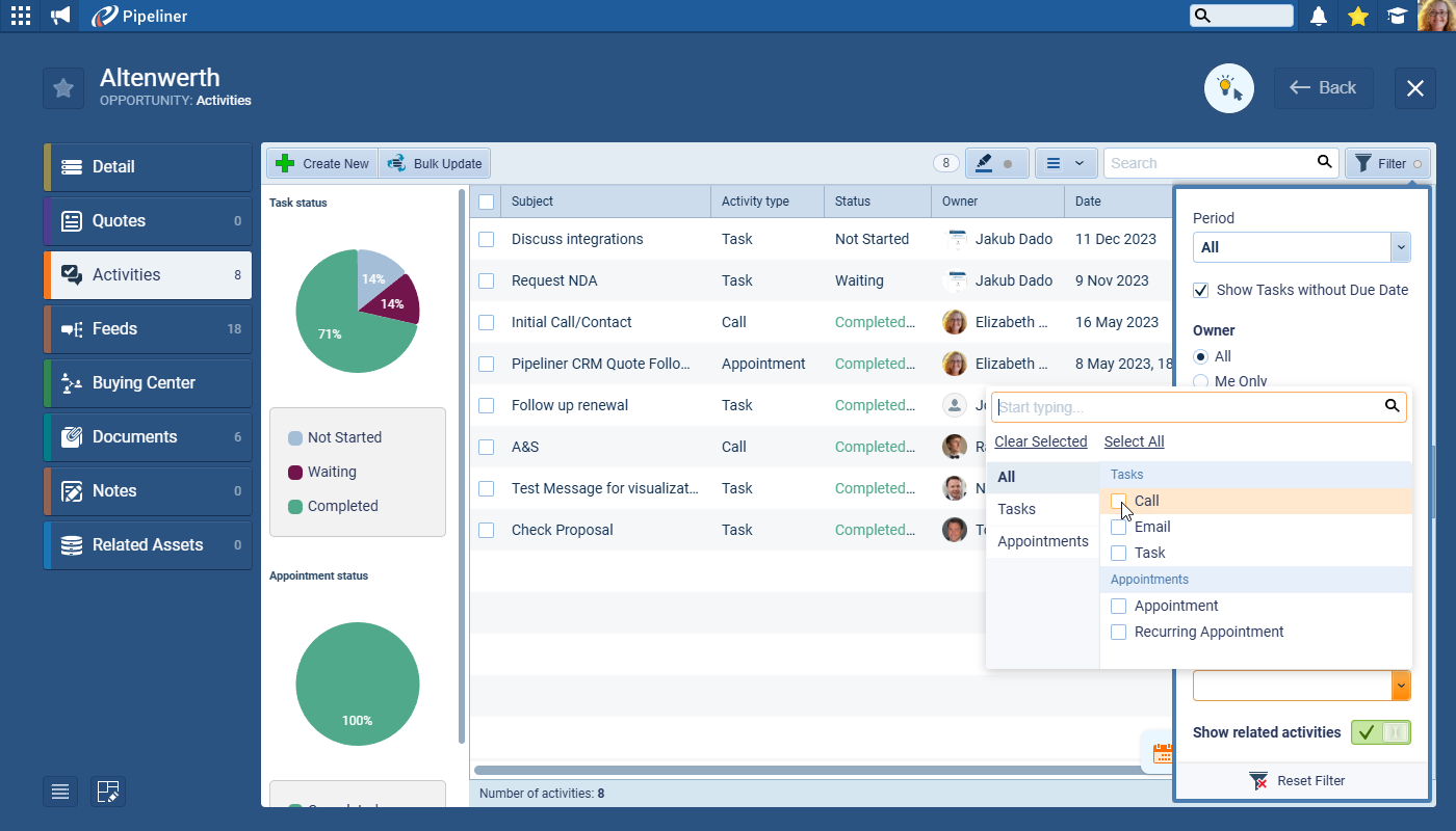 In the “Activities tab” of an open record, the “Activity Type Filter” has been replaced with a multi-select component with categories to allow more flexible filtering of activities. ⤵
